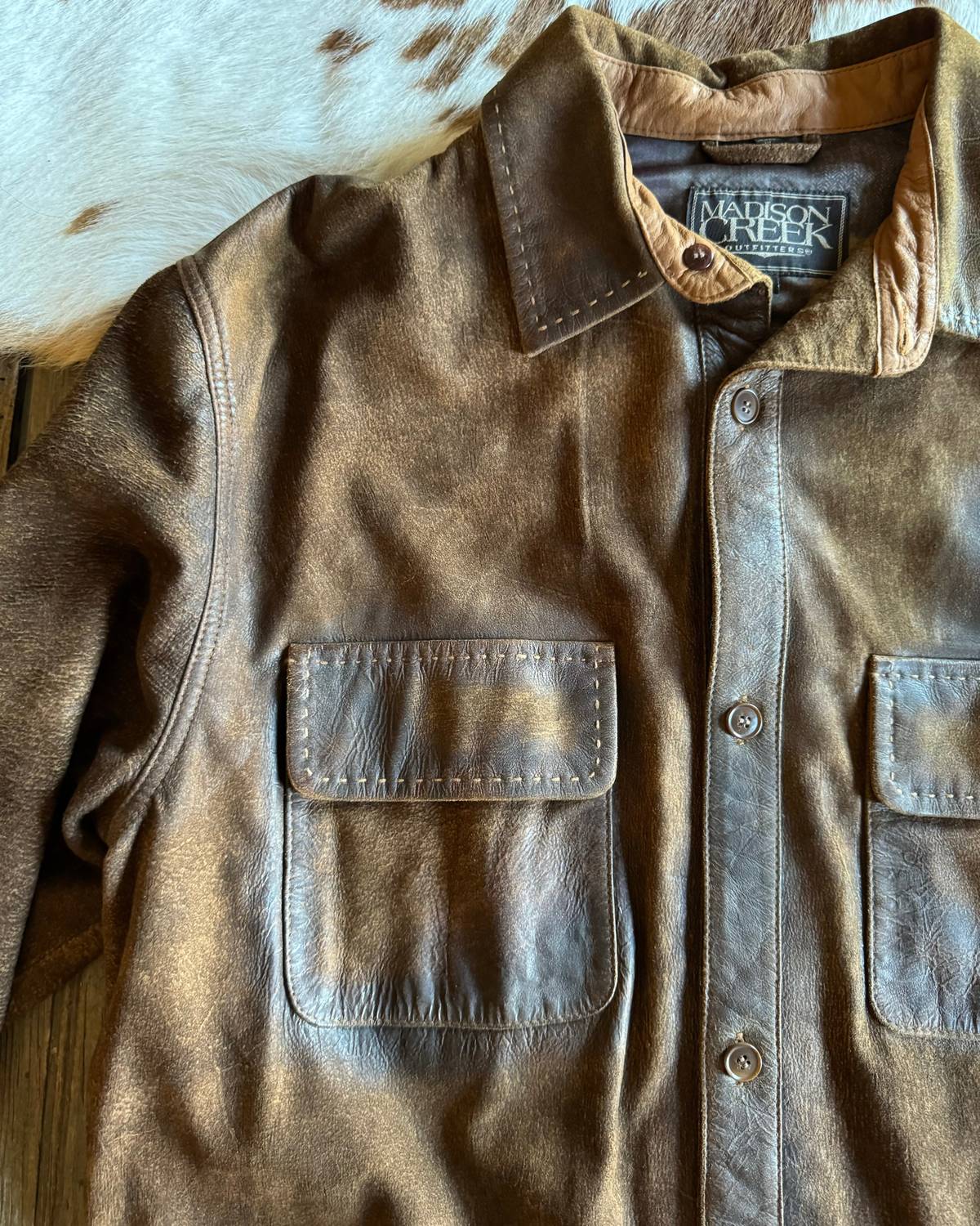Introducing the Madison Creek Outfitters Cumberland Shirt Jacket in a rugged Vintage Brown shade, perfect for the discerning gentleman. Designed with practicality in mind, this shirt jacket features convenient front chest pockets and side pockets with a secure magnetic closure. Effortlessly blend style and functionality with this essential leather piece. Ideal for versatile vest layering, this top layer transitions seamlessly between casual and refined outfits.