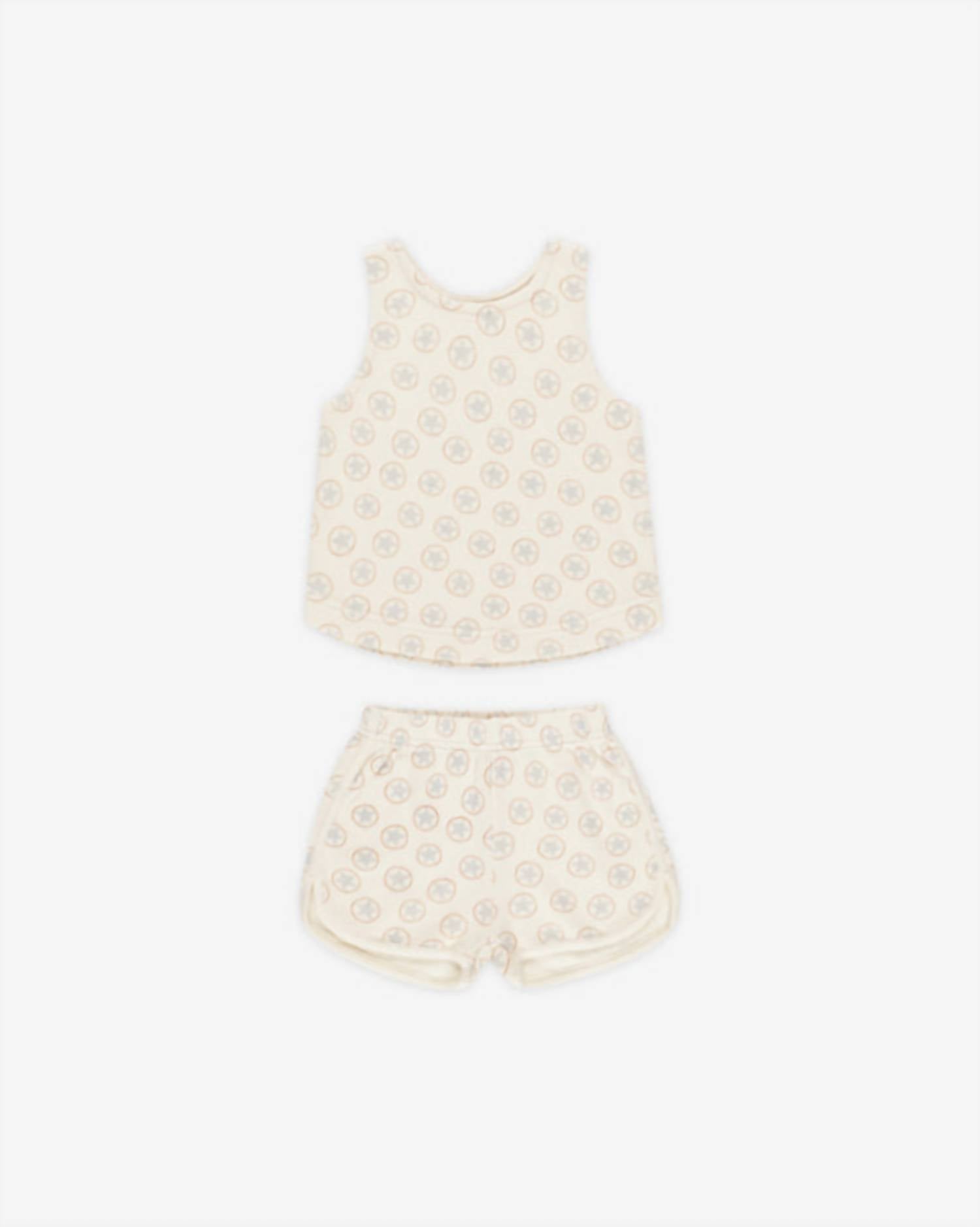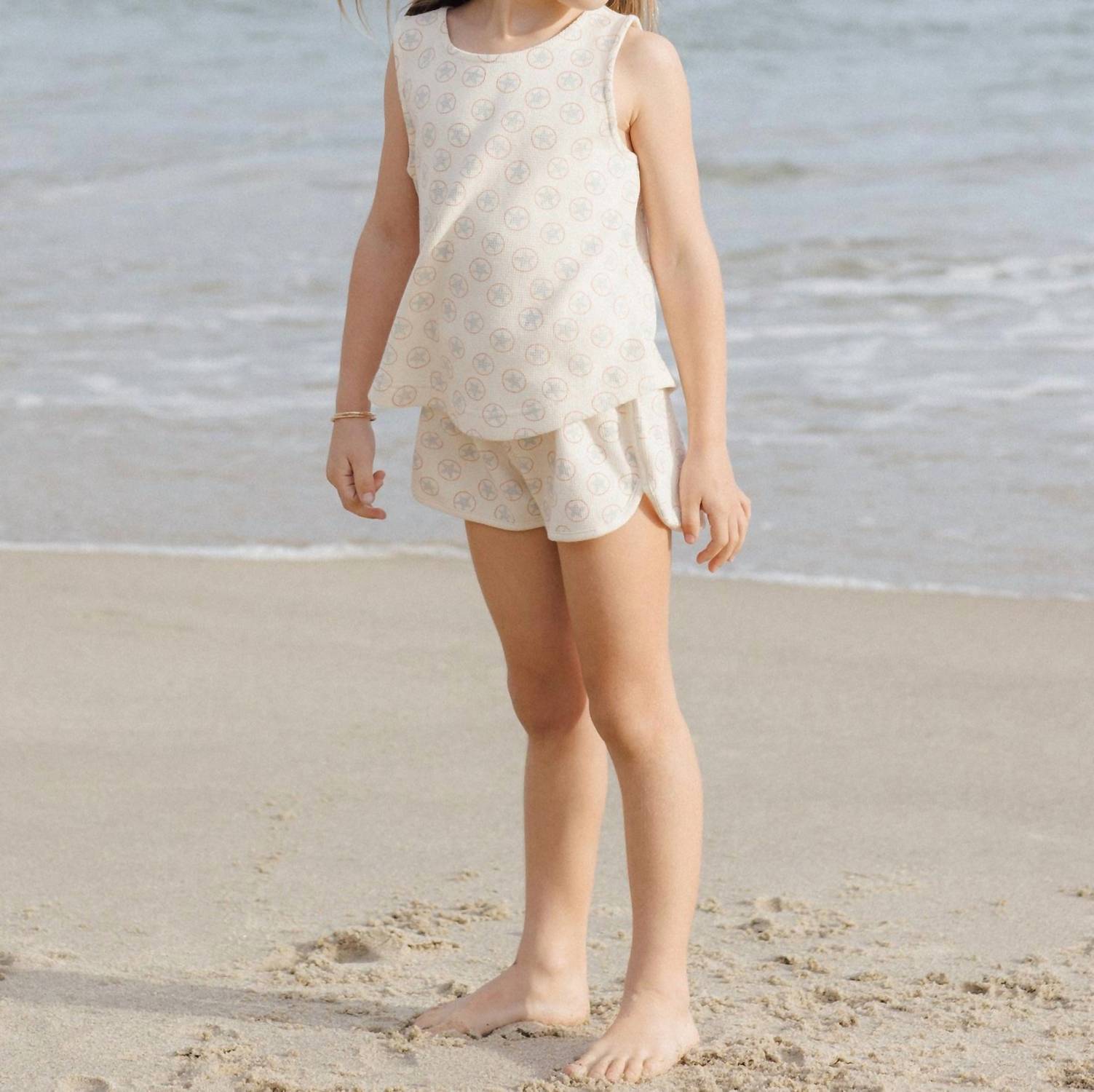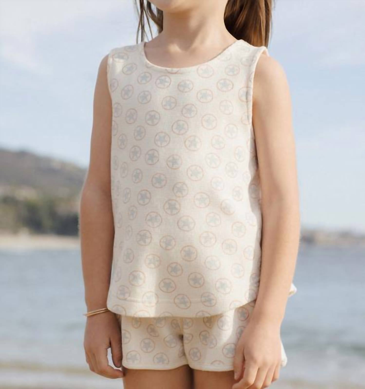 This cozy set includes a cropped tank top and matching shorts, crafted from soft waffle knit fabric for all-day comfort. Featuring a subtle seaside-inspired print, it’s perfect for laid-back, breezy days. Made of 100% cotton. Care with machine wash cold, tumble dry low.