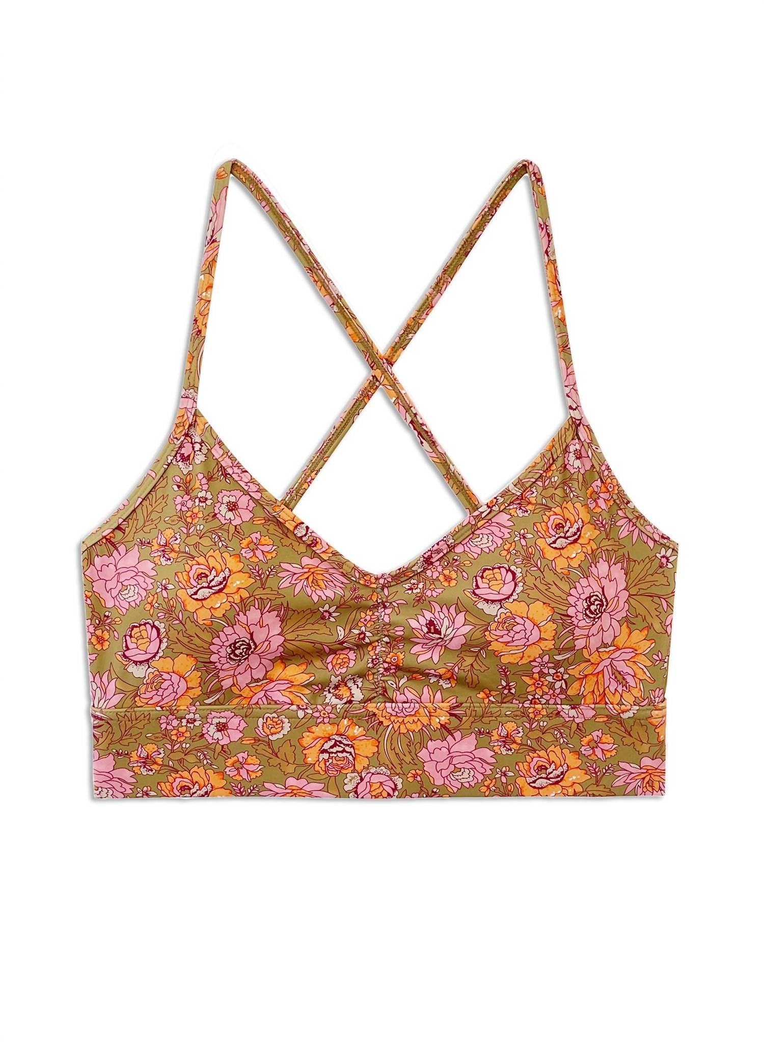 Introducing the Girl's Satnam Yoga Bra by Louise Misha, a stylish choice in a vibrant bronze floral pattern. Crafted with 75% recycled polyamide and 25% elastane, this bra offers comfort and sustainability. It features thin, crossed straps in the back for added flair. Simply slip it on for an effortless fit.