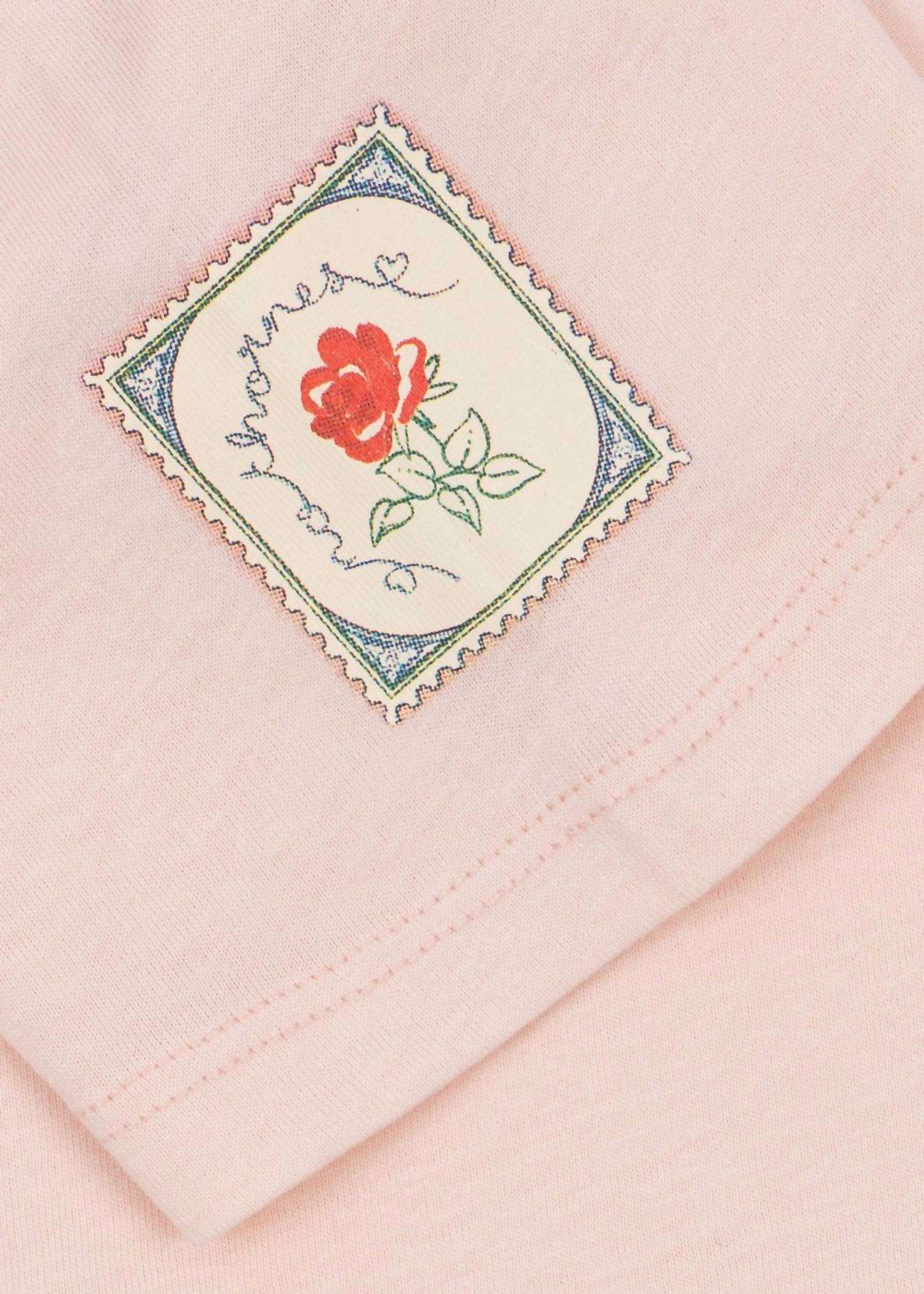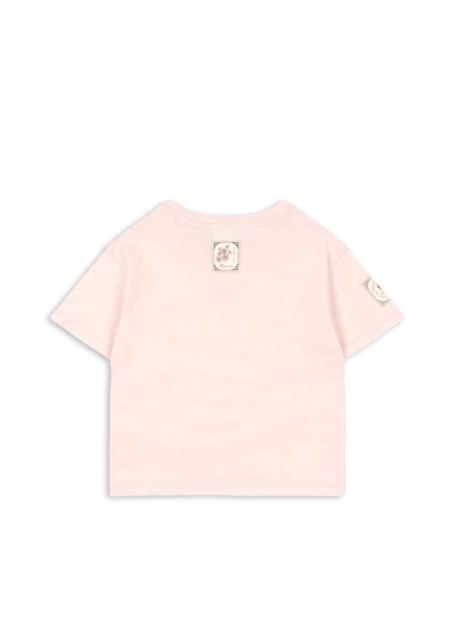 Introducing the Kids Lettre Top by Konges Sløjd, a delightful addition to your child's wardrobe. Crafted from 100% organic cotton, this short sleeve tee offers a relaxed fit with dropped shoulders and a slightly boxy silhouette. Made in Turkey, this top features sweet little stamp decorations that evoke a letter of love, perfect for any summer occasion. Care instructions recommend machine washing for easy maintenance.