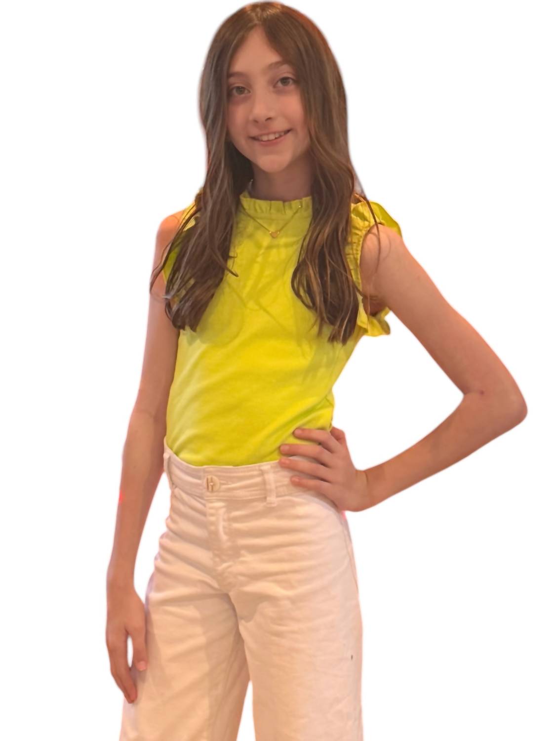 Experience the adorable charm in a vibrant lime hue. Sleeveless piece features a super soft ribbed texture. Crafted from 95% cotton and 5% spandex for a snug fit. With a playful ruffle detail. We recommend sizing up for optimal comfort. Button closure for easy wear.