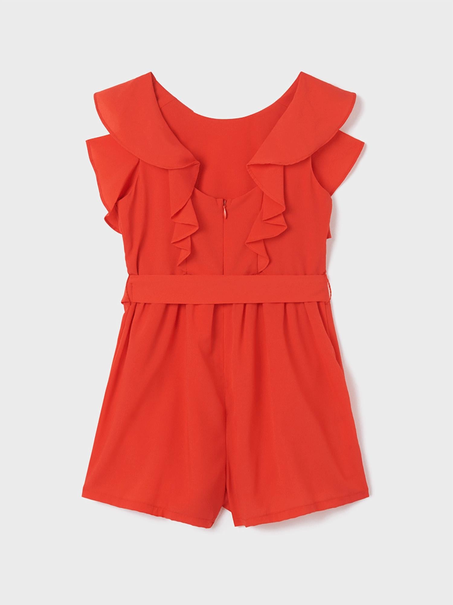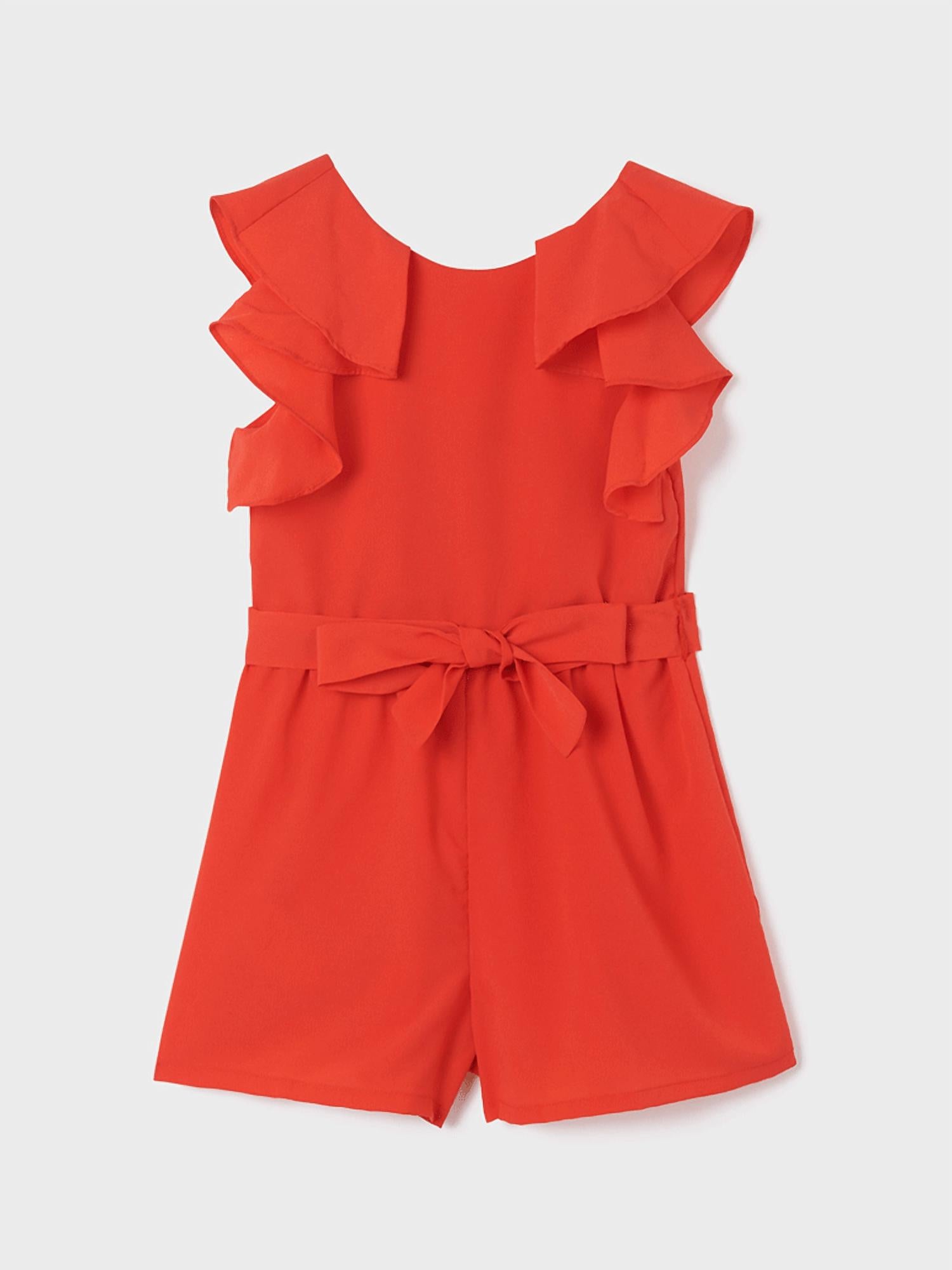 Elevate your girl's summer wardrobe with the Girls' Ruffle Playsuit by Mayoral, perfect for beach trips or warm days out. This red playsuit features soft flutter sleeves and a ruffle detail for a charming look, crafted from comfortable 100% polyester crepe material. Fitted with a tie waist, it closes at the back with a zipper for easy wear. Care is simple with machine washability at 30 degrees.