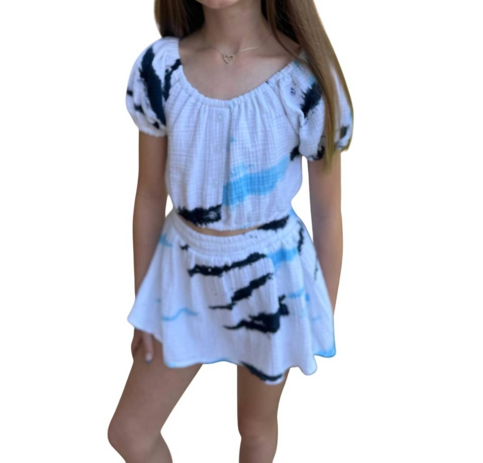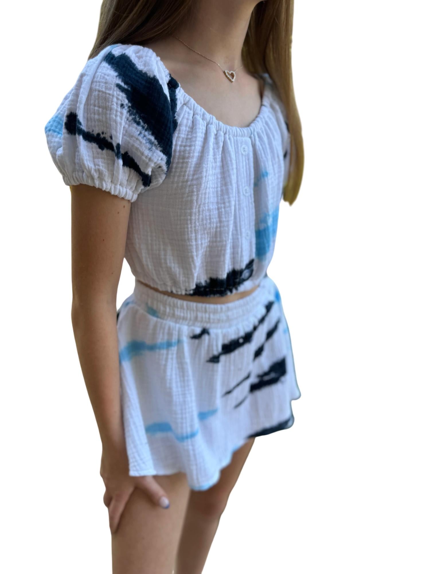 Elevate her wardrobe with the Flowers by Zoe Girls Cropped Top, featuring stylish white and blue tie-dye puff sleeves. Made from a cotton blend, this crop top provides comfort and a fun vibe, complete with front buttons and an elastic hem. Closure: Button closure. Care: Hand wash only.