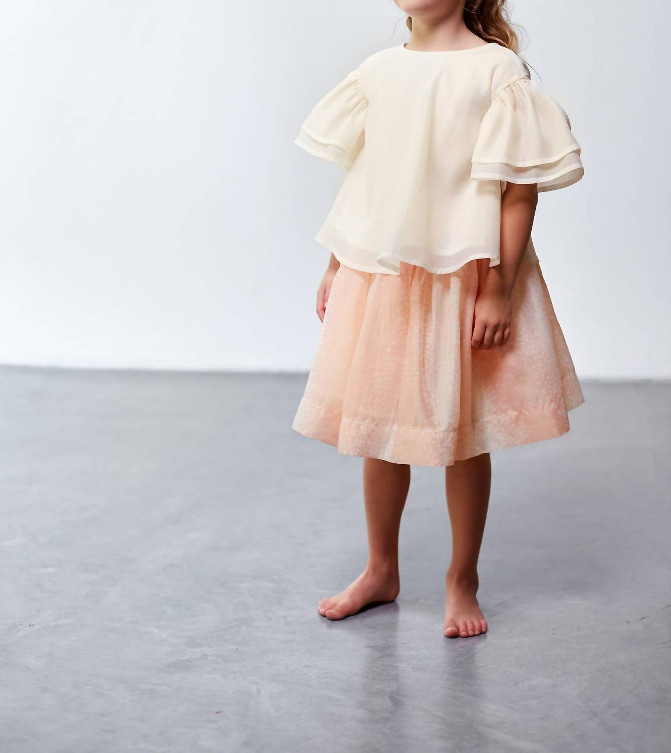 Full, layered skirt features an elasticized waistband, beautiful printed organza fabric with just a little sheen, and below the knee length. 100% Polyester, lining 100% Cotton.
