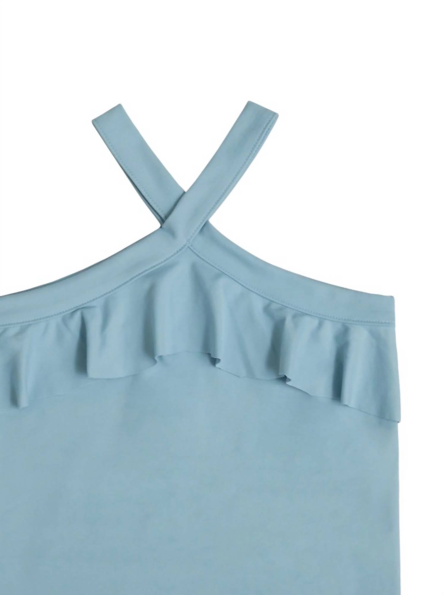 Elevate your summer wardrobe with the Girls' Flutter Crossover Tank by MIA, a stylish choice for vacation-ready looks. This lagoon blue tank features a cross front strap detail with a flutter ruffle trim that adds a playful touch. Crafted from a stretch fabric blend of 90% Polyester and 10% Spandex, this pullover design offers a fitted silhouette with coordinating stitch details throughout. For care, turn the garment inside out, machine wash cold with similar colors, and line dry.