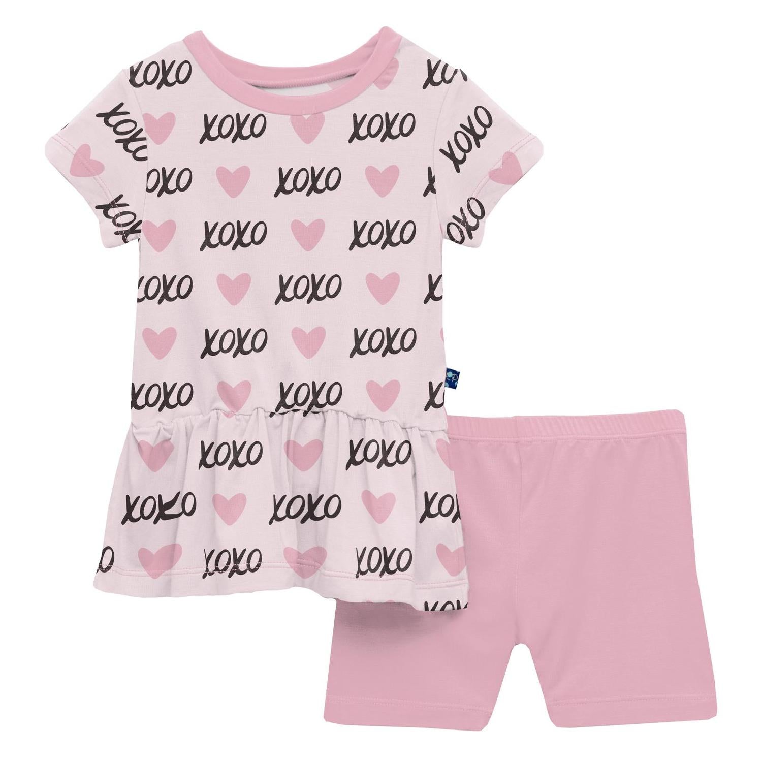 Introduce her to style and comfort with the KICKEE Girl's Short Sleeve Playtime Outfit Set in Shrinking Violet Xoxo. The set includes a peplum style top with short sleeves and matching elasticized waist shorts that offer easy pull-on styling. It is crafted from the signature KICKEE Bamboo Signature Blend made of 95% viscose from bamboo and 5% spandex, known for its lightweight, breathable, and temperature-regulating qualities. Enjoy no-fuss care with machine wash and low tumble drying options, ensuring she stays comfy and cute from preschool to playdates.