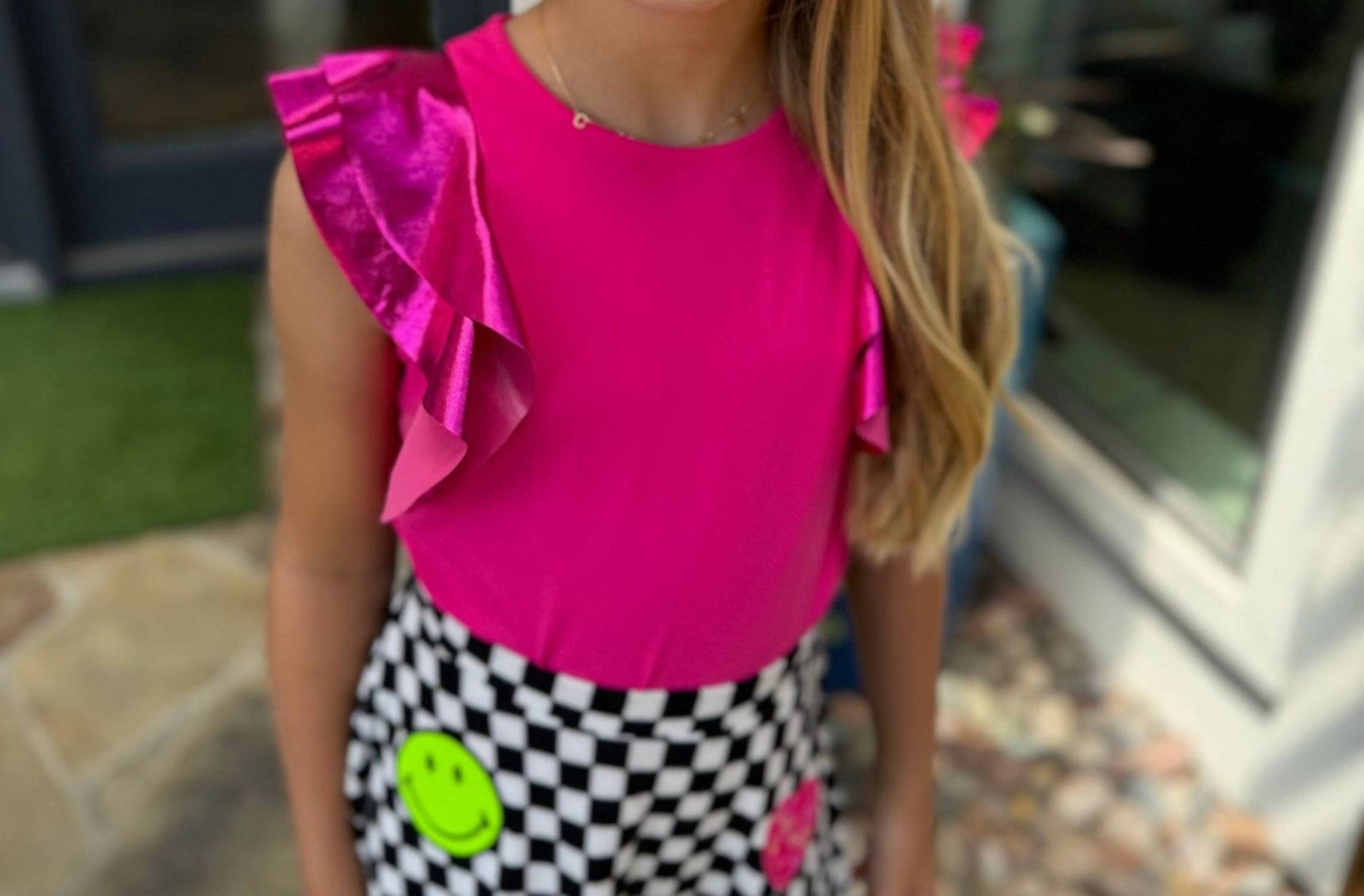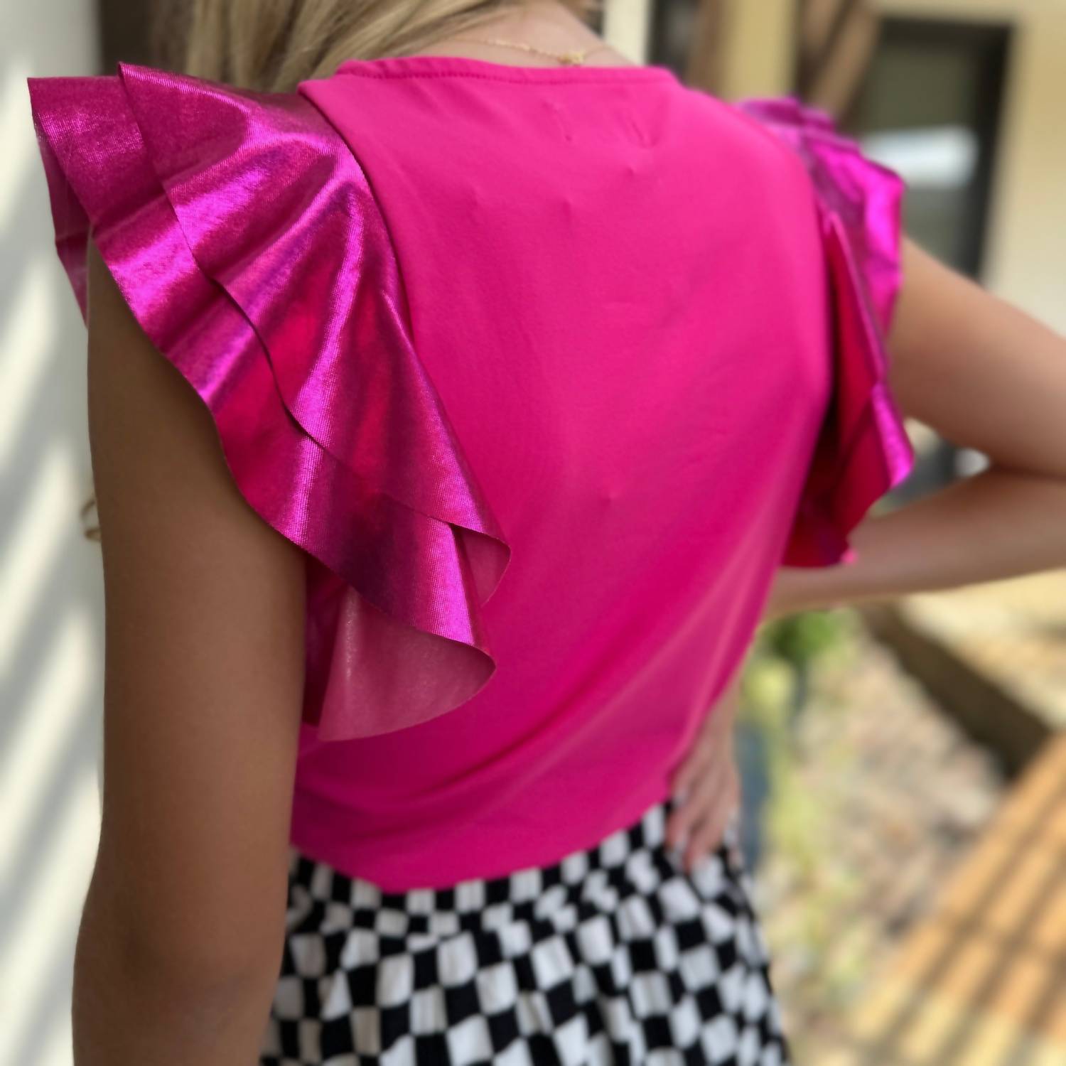 Chic and charming pink blouse. Features playful metallic flutter sleeves paired with a soft cotton bodice. Crafted from 90% polyester and 10% spandex. Ensures comfort and style. Care instructions, Machine wash and line dry.