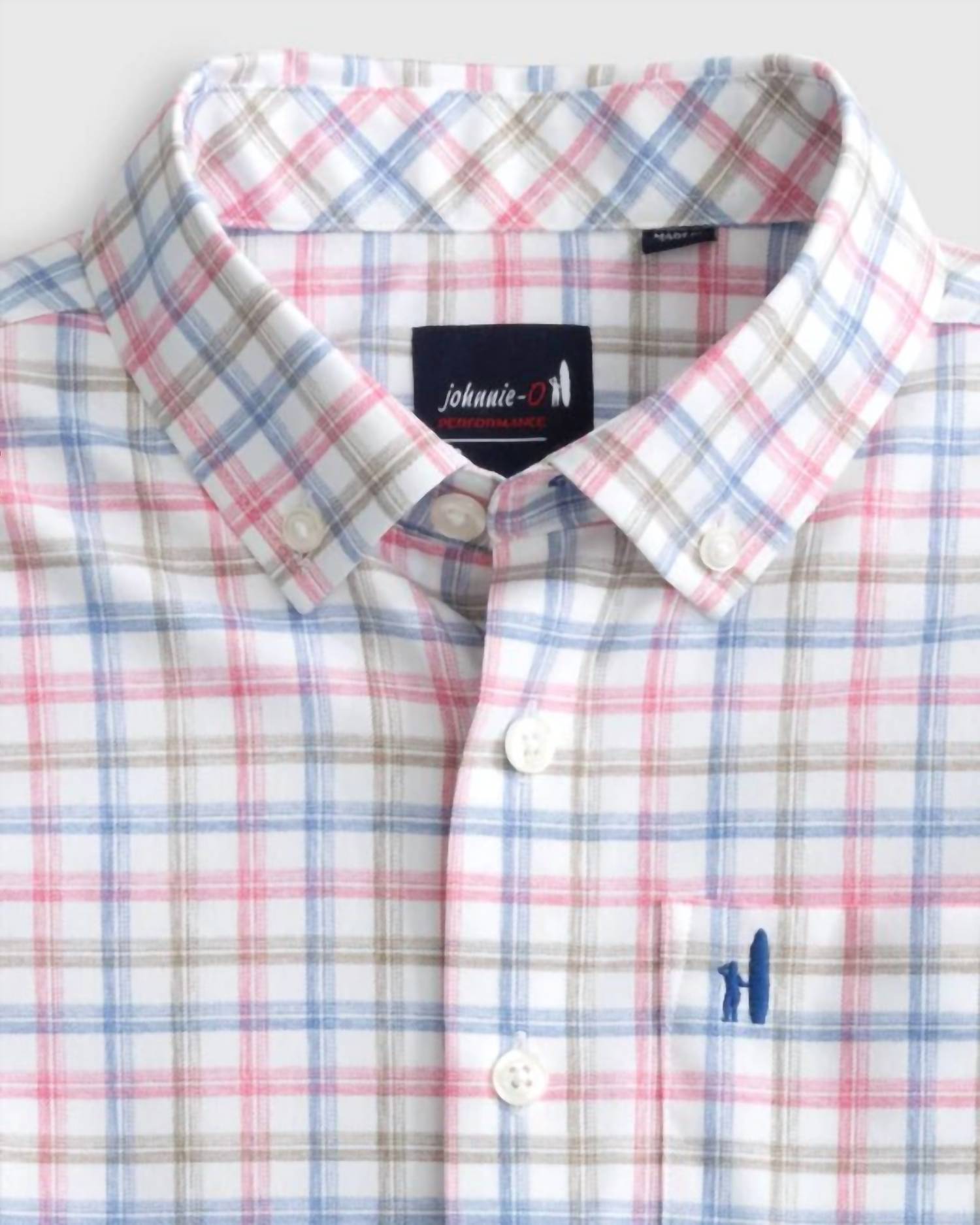 Meet the Boys Hauser Performance Button-up Shirt by Johnnie-O, designed for school and stylish summer days. This plaid shirt combines comfort and durability with its wrinkle-resistant composition of 40% Nylon, 28% Polyester, 28% Bamboo, 4% Spandex. Care is a breeze with machine wash on a cold gentle cycle and tumble dry on low settings. Perfect for back-to-school occasions, add a touch of trendiness with its Y2K vibe this Christmas season.