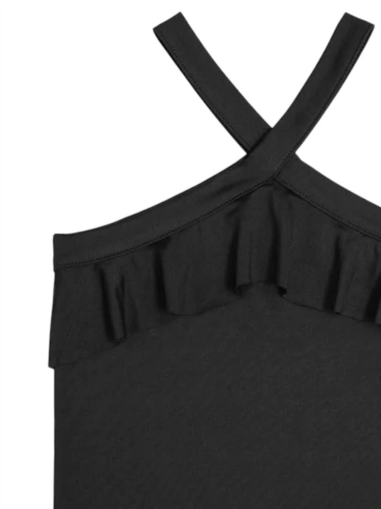 Meet the Girls' Flutter Crossover Tank by MIA, a stunning piece in jet black that perfectly balances edgy and girly vibes. This sleeveless top features a crossover strap detail with a fitted, stretch body and a charming ruffle accent on the chest. Composition: 90% Polyester, 10% Spandex. Closure: Pull-on design. Care: Machine wash cold with similar colors, do not bleach, line dry.