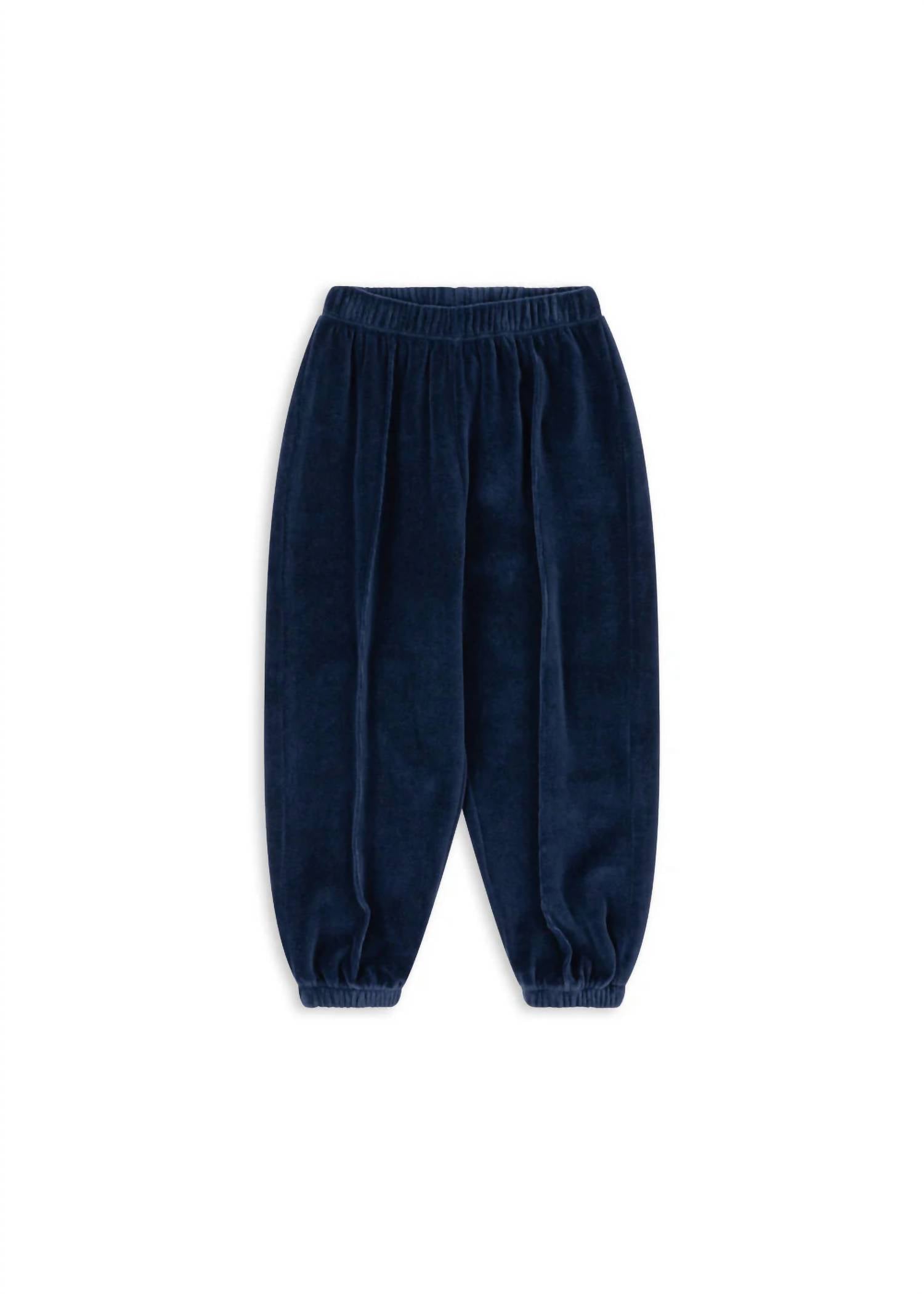 Introducing the Wally Sweatpants by Konges Sløjd, crafted in a luxurious Dress Blue soft velvet fabric sure to delight. Designed for boys, these sweatpants offer a snug fit with a stretchy waistband and elastic cuffs, ensuring comfort and flexibility. Made from a premium blend of 80% organic cotton and 20% recycled polyester, these pants are not only stylish but environmentally conscious. Designed in Denmark and made in China, they embody Scandinavian simplicity and quality.