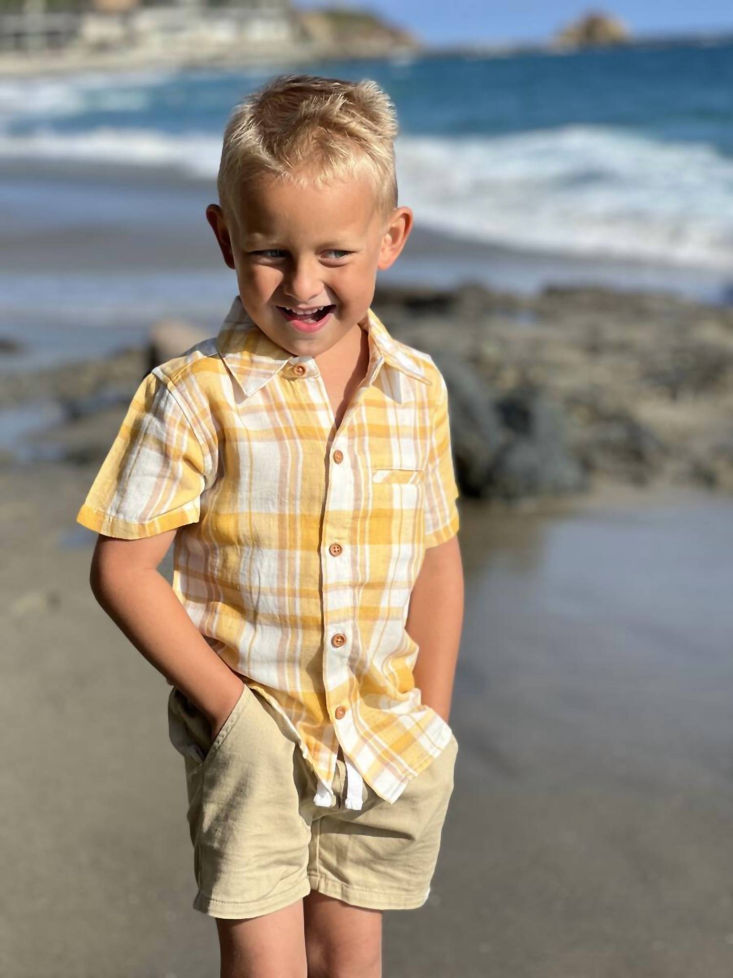 Introducing the Boy's Plaid Woven Shirt by ME & HENRY, a charming choice in Newport Gold for a touch of retro flair. With its 100% cotton composition, this shirt delivers comfort and style in a classic plaid pattern. Ideal for a summer beach day, it features a button closure that ensures an easy fit. Care instructions: Hand wash and lay flat to dry.
