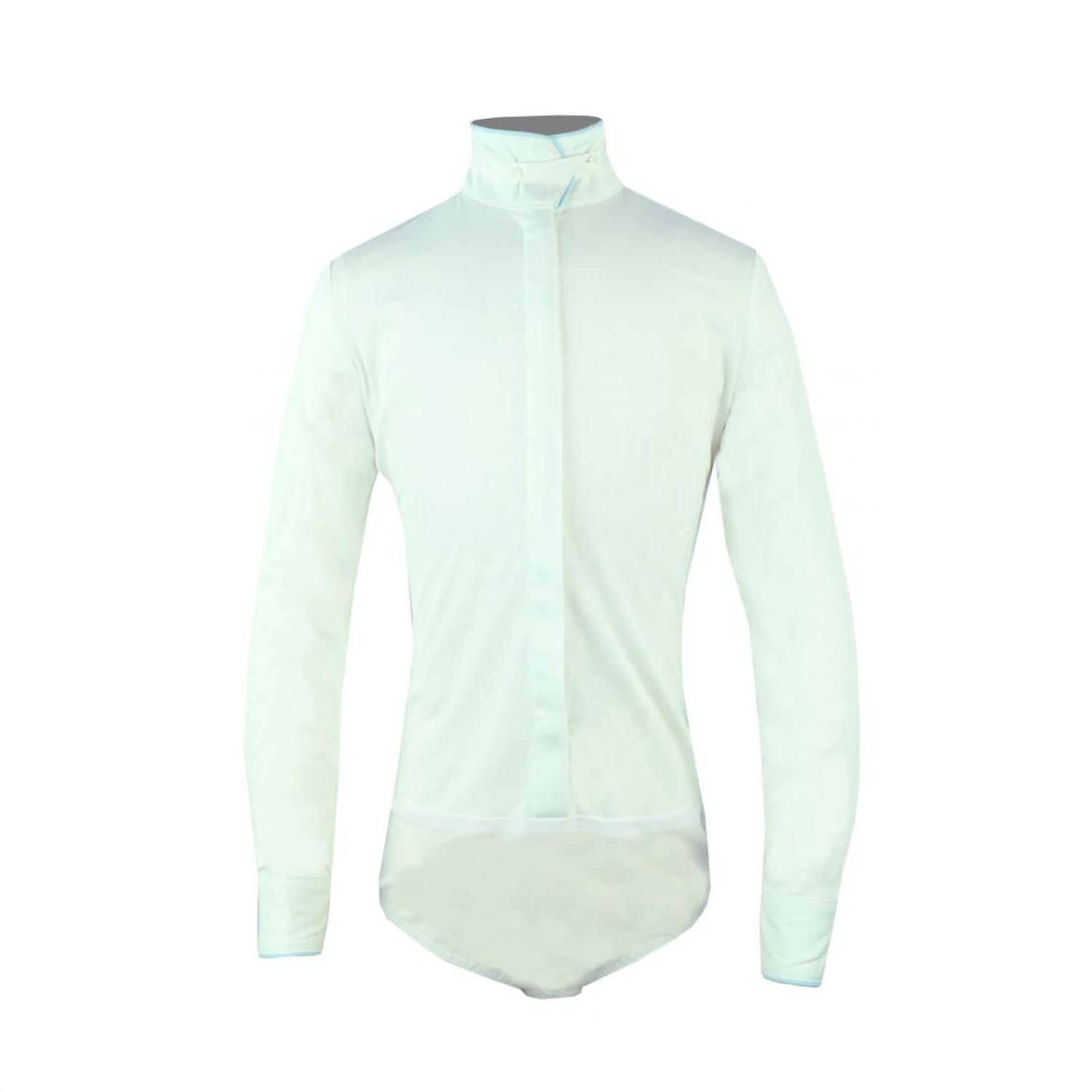 KAKI McLane Body Suit Show Shirt is a crisp white cotton pique show shirt with contrasting "kaki" blue piping. Durable snap closures on sleeves and body. Button tab collar. Full panty with high front snap closure is unique to KAKI.Material: 97% Cotton, 3% Spandex (body), 95% poly, 5% spandex mesh (panty).Machine Washable.