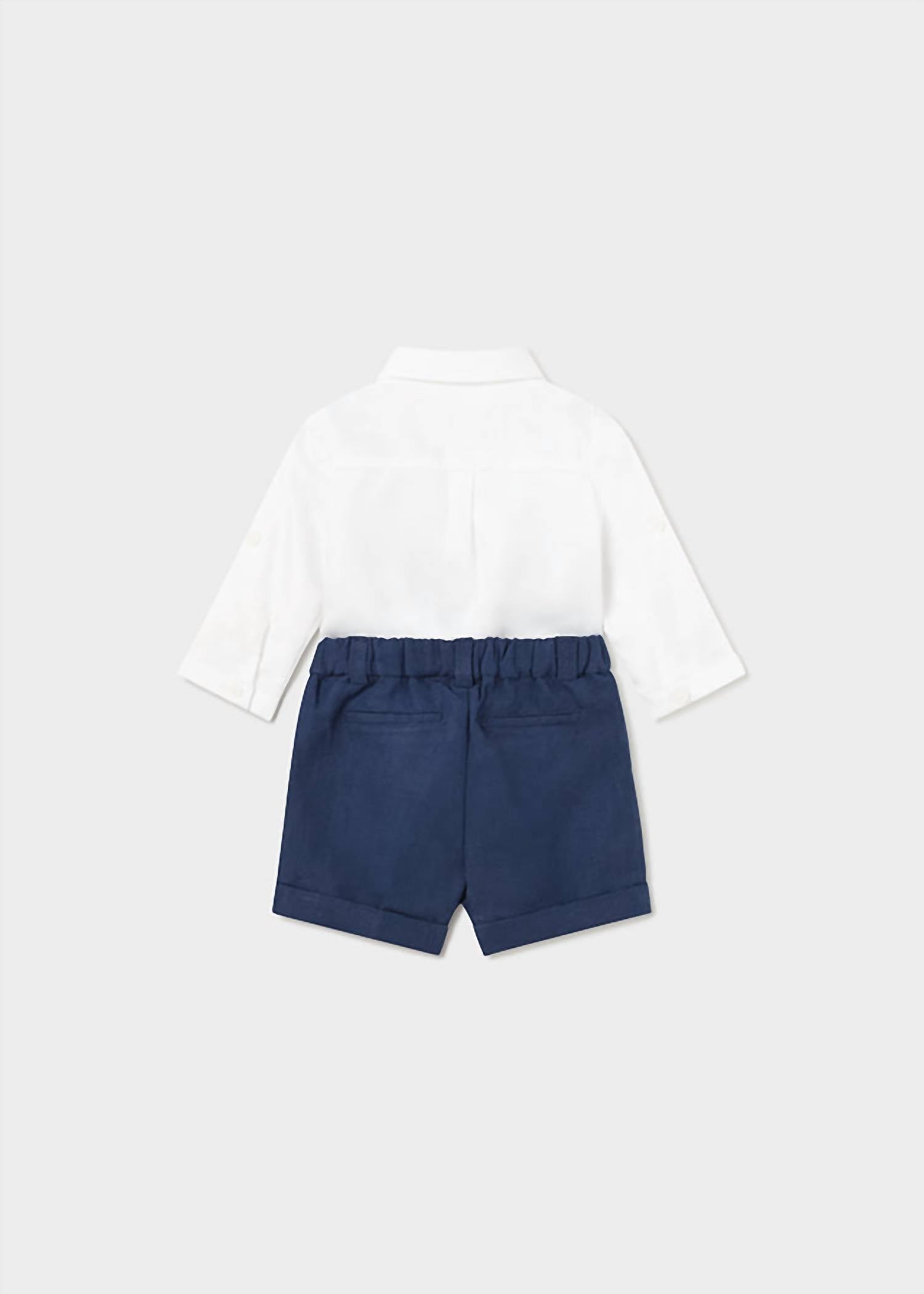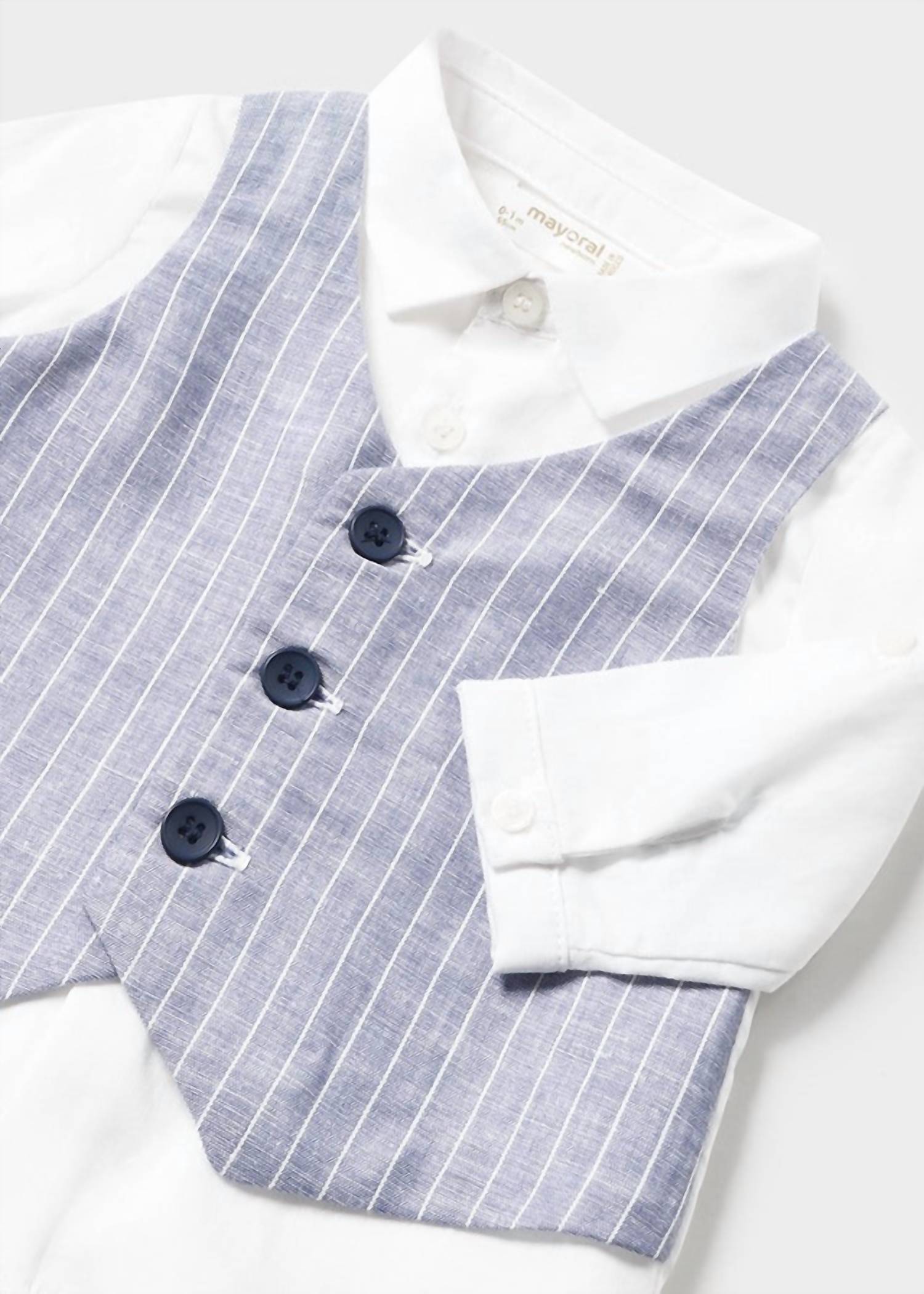 Elevate your newborn's wardrobe with the Mayoral Kid's 3pc Short Vest Set, perfect for any dressy spring or summer occasion. This adorable set includes a white button-down long sleeve shirt, complemented by a pale blue vest featuring white stripes and navy buttons for a smart look. The matching navy shorts complete the outfit, providing a coordinated and lightweight ensemble. Crafted from 55% Cotton, 45% Linen , this set ensures your little one is both stylish and at ease.
