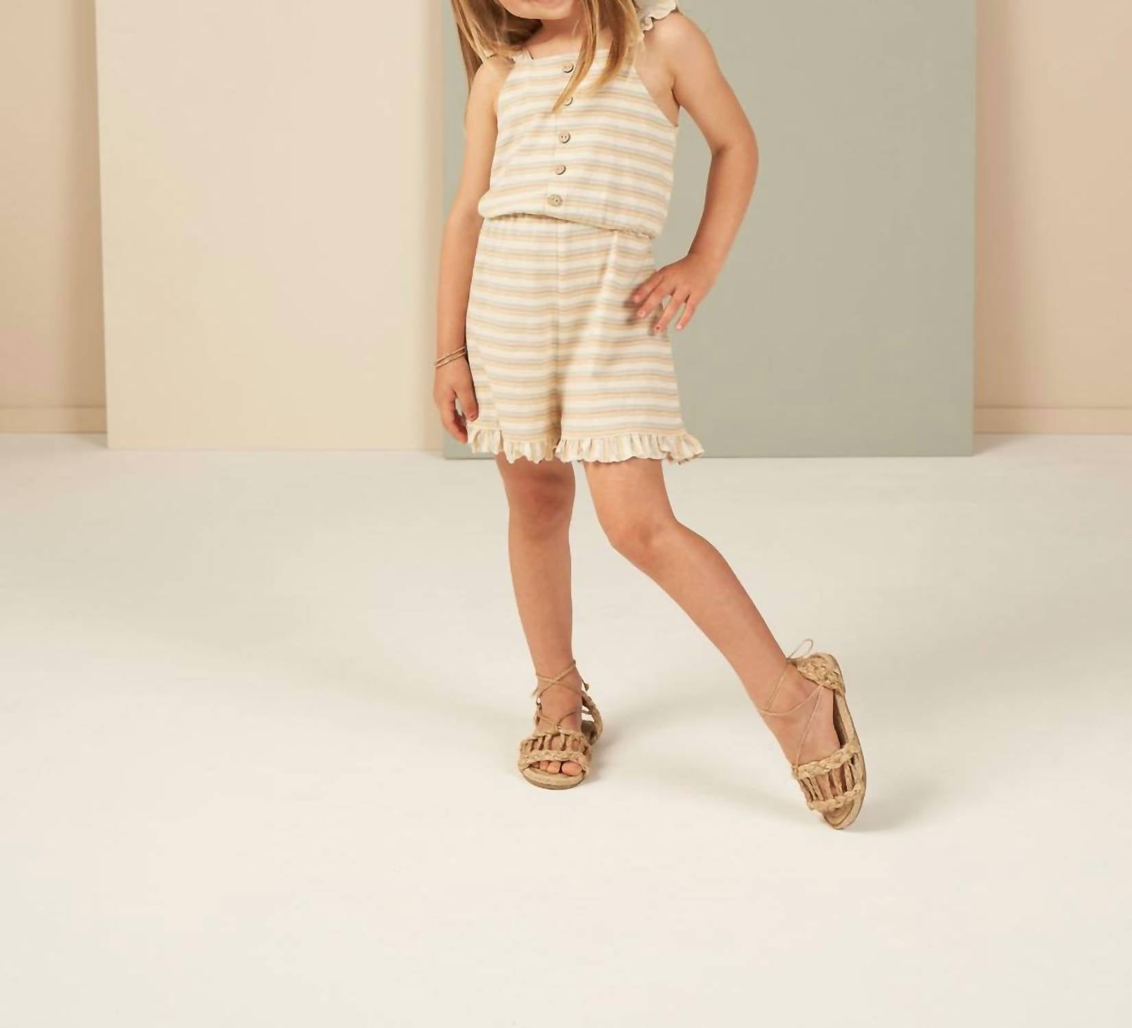 The Rylee + Cru Addy Romper in Vintage Stripe is a charming addition to your little girl's spring wardrobe. This sleeveless romper is made from 100% cotton, ensuring comfort and ease of wear. With a button detail down the front, ruffle accents on the straps and bottom hem, and a cinched waist, it pairs style with practicality. Care instructions include machine washing cold and tumble drying low, making it perfect for play and travel.