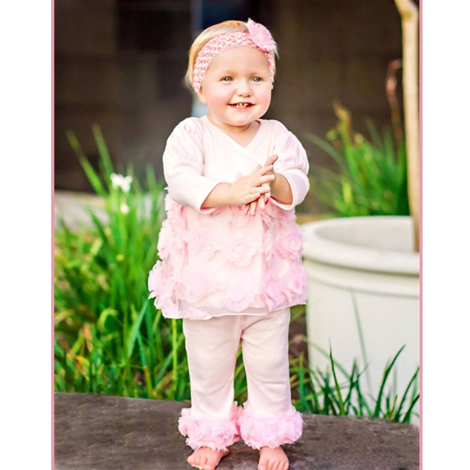 Dress her in elegance with the Haute Baby "Emma Rose" 2 Pc. Legging Set, perfect for any occasion. This charming ensemble, lovingly made in the USA, features a top adorned with a criss-cross neckline and embellished with pink chiffon roses and a satin pink bow with a jeweled center. The matching pull-up leggings are made of 100% cotton, ensuring softness against her skin. The hems are accented with the same pink roses, creating a beautifully cohesive look.