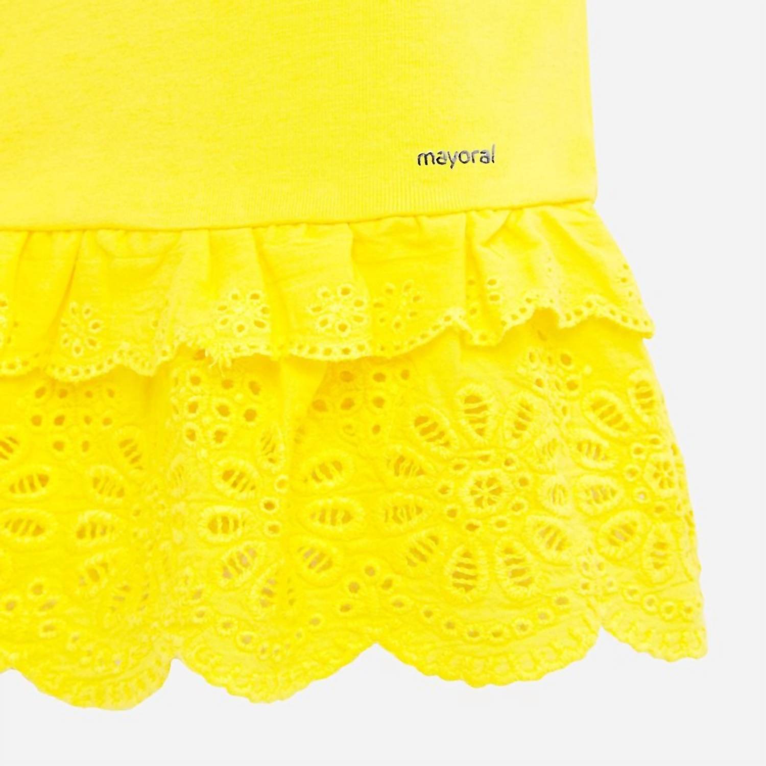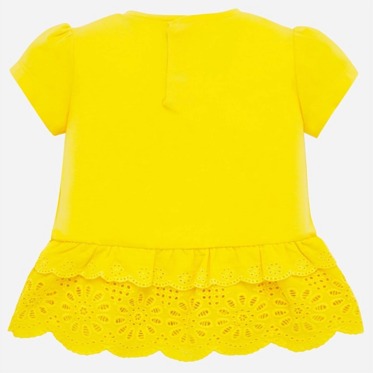Introducing the Girls' Short Sleeve Eyelet Floral Tee by Mayoral, a charming choice in a delightful Daffodil shade. This blouse features cap sleeves with a hidden double button closure on the upper back and is crafted from a cotton blend consisting of 98% cotton and 2% elastane. The pull-on design showcases a beautifully eyelet tiered bottom hem, perfect for a vacation look. Care for this summer essential by machine washing and line drying to maintain its elegant textured pattern.