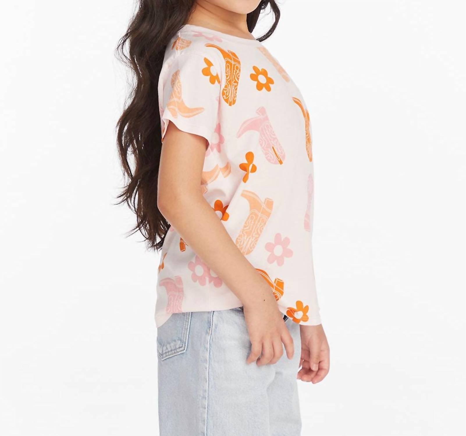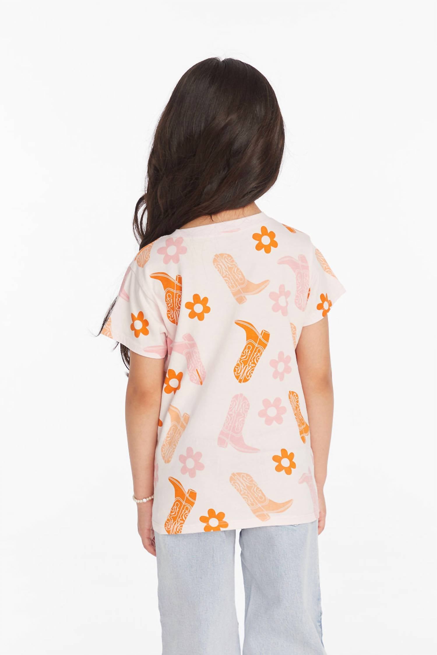 Delightful short sleeve tee. Crafted from soft 100% cotton. Ensuring comfort while showcasing a playful orange and pink cowgirl print. Care is simple with machine washable instructions. Designed for fun-filled days.