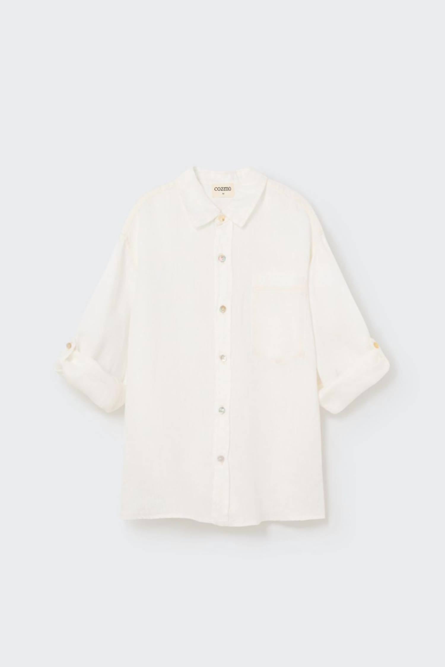 Elevate your little one's wardrobe with the Kid's Eric Shirt by Cozmo, a beautifully crafted long sleeve button-down in a breezy solid ivory. This shirt features a handy chest pocket and charming wooden buttons, making it both stylish and functional. Made from 100% Linen, it is designed and meticulously crafted in Barcelona. For care, simply cool machine wash with similar colors and avoid bleach.
