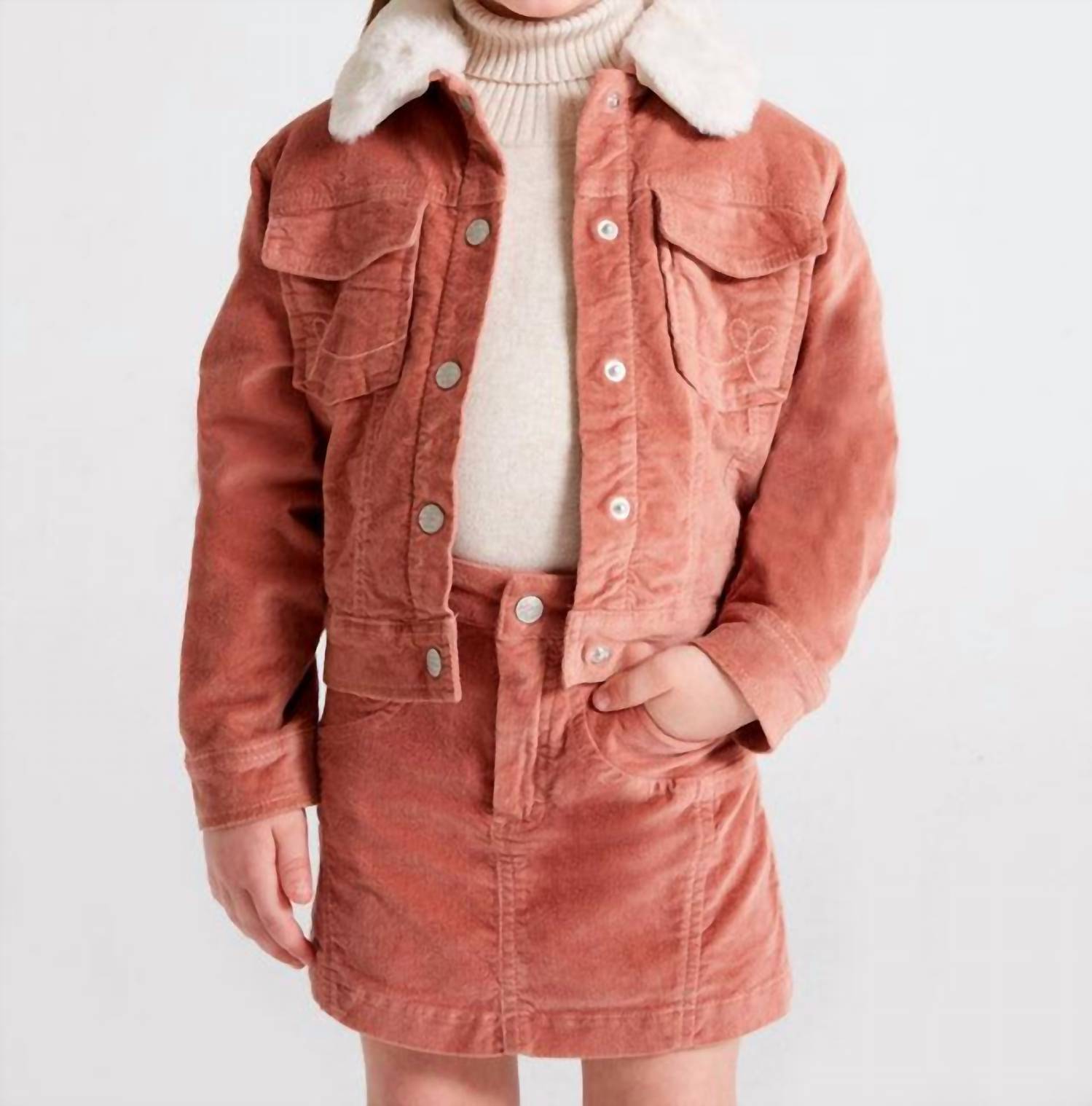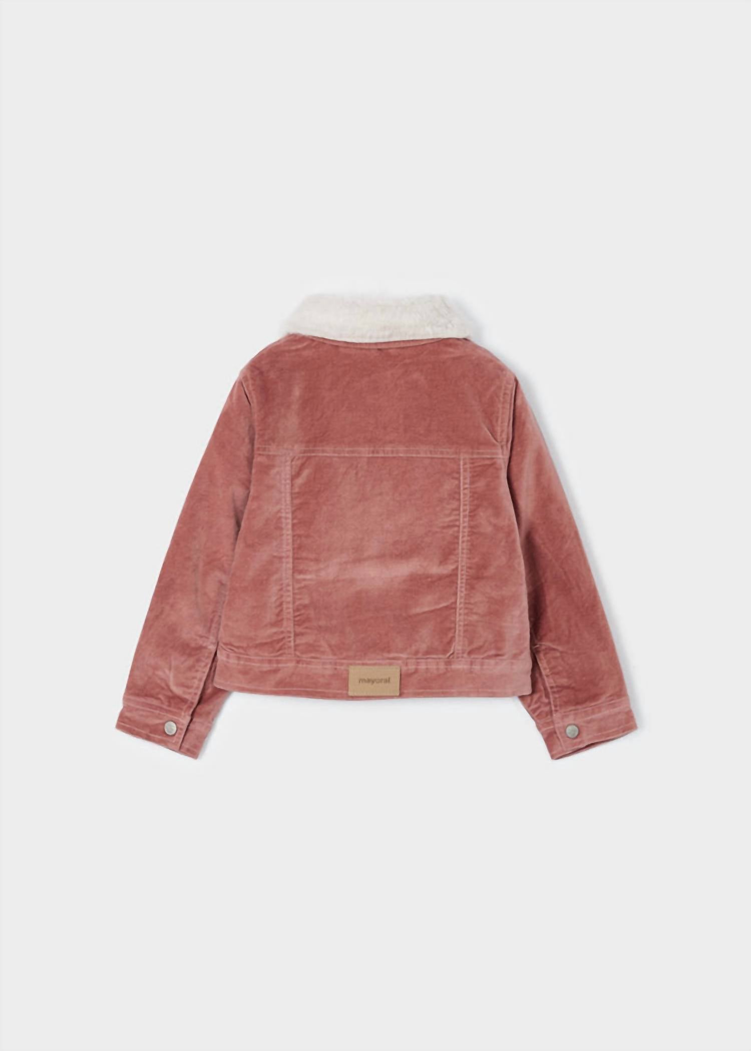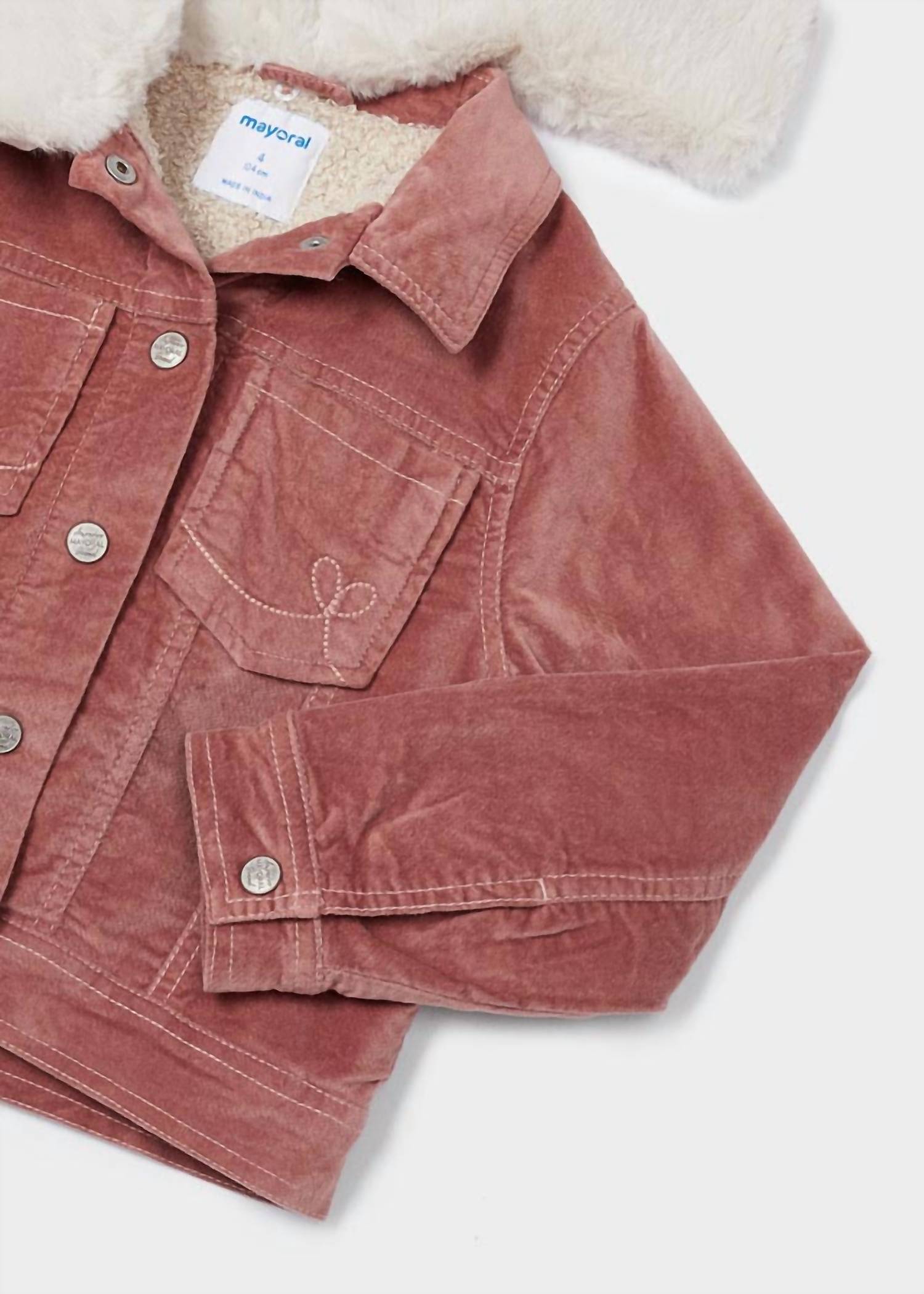 Introducing the Kid's Faux Fur & Corduroy Jacket by Mayoral, perfect for cozy fall days in a warm rose hue. This solid, relaxed silhouette features a collared neckline with a detachable faux fur collar and patch pocket accents. Made from 94% Cotton, 5% Polyester, and 1% Elastane, it has a flat nickel snap button closure. Lined with cozy sherpa for added warmth, care is hassle-free with machine wash cold instructions and tumble dry low settings.