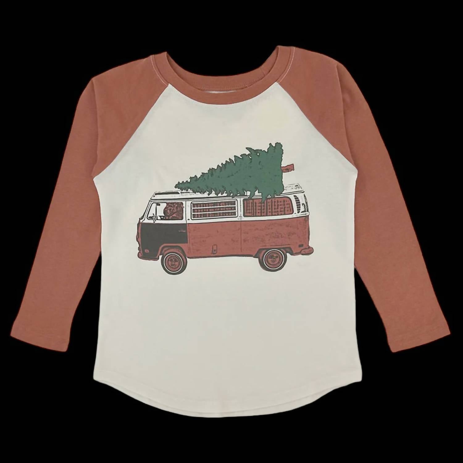 Introducing the Boys' Christmas Mobile Long Sleeve Raglan Top by TINY WHALES, perfect for charming seasonal style. This natural and brick-colored tee comes with long raglan sleeves and features a delightful vintage van graphic carrying a Christmas tree. Made from 100% Cotton Jersey, it ensures comfort and breathability. Care instructions: Machine washable and tumble dry for easy maintenance. Printed with non-toxic water-based ink for safe and vibrant graphics, it's ideal for winter vacations and maximalist holiday trends.