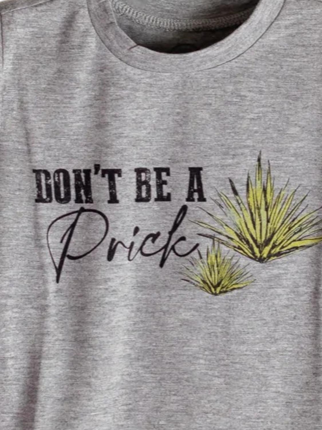 2 Fly Kid's Don't Be A Prick Tee. Gray color. Soft and premium fabric. Hand-selected for top quality. Unique feel and superior comfort. Playful and meaningful design. Made from 70% cotton, 20% polyester, 10% spandex. Durable and stylish for everyday wear.