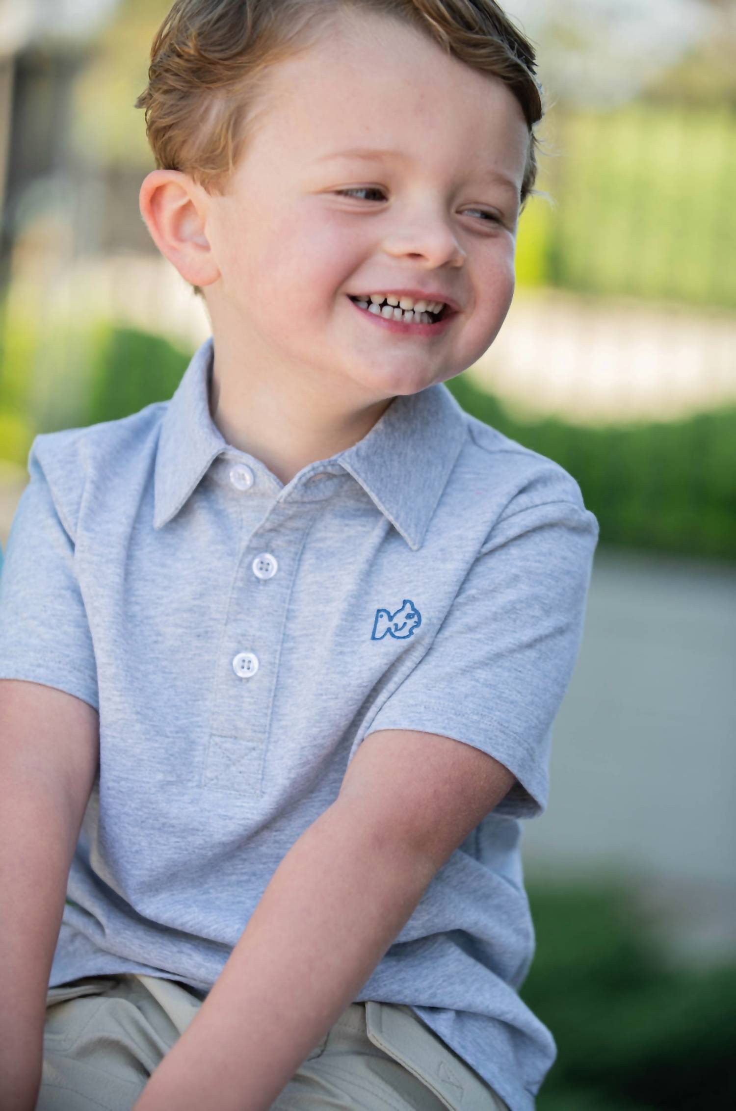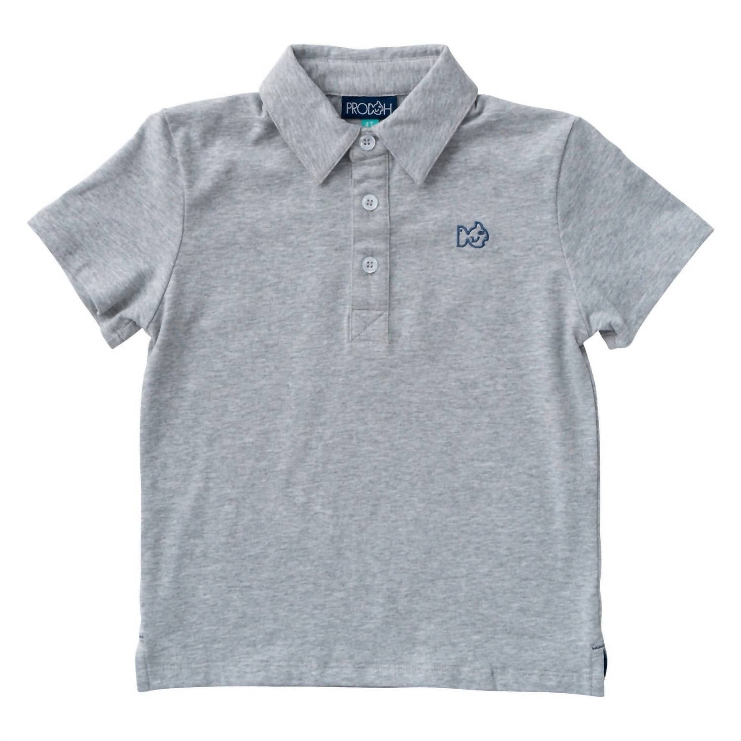 Meet the Boys' Too Cool For School Polo by PRODOH, a perfect blend of style and comfort for any young gentleman. Crafted from a 92% cotton and 8% spandex jersey fabric, this grey polo is school uniform-approved and features a small logo on the front left chest. Proudly designed in the USA and imported, it includes the signature "Get Back Here Loop" for added charm. Care instructions include machine washing and tumble drying to ensure easy maintenance.