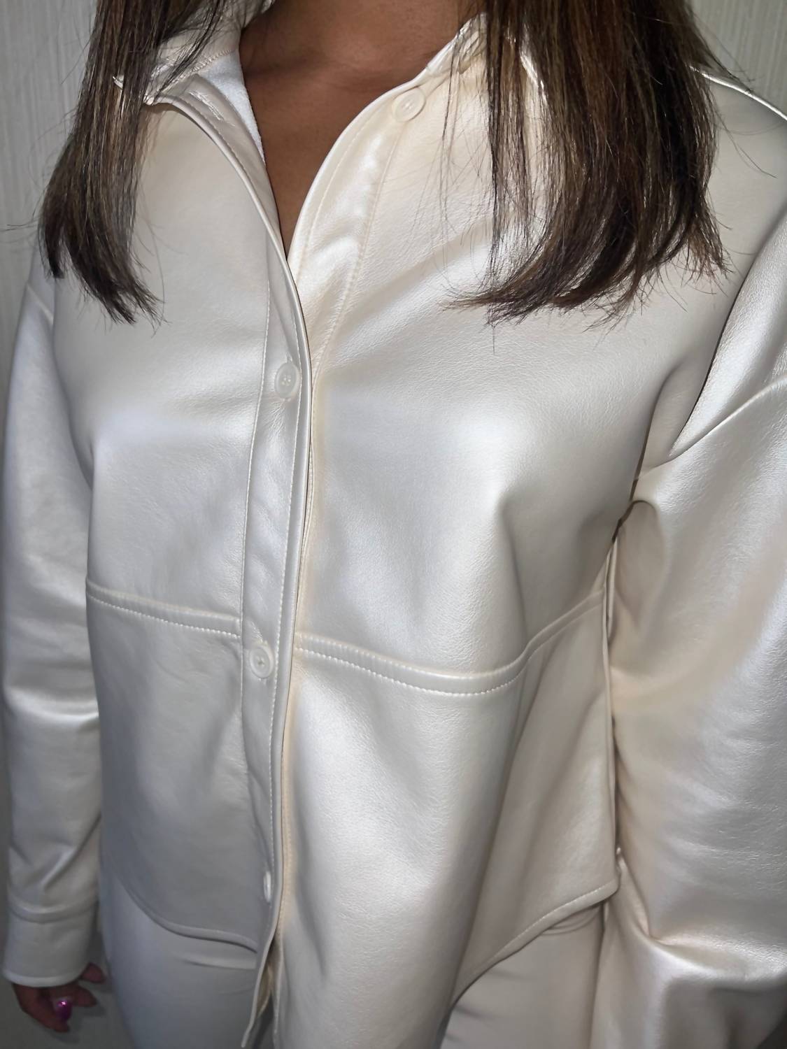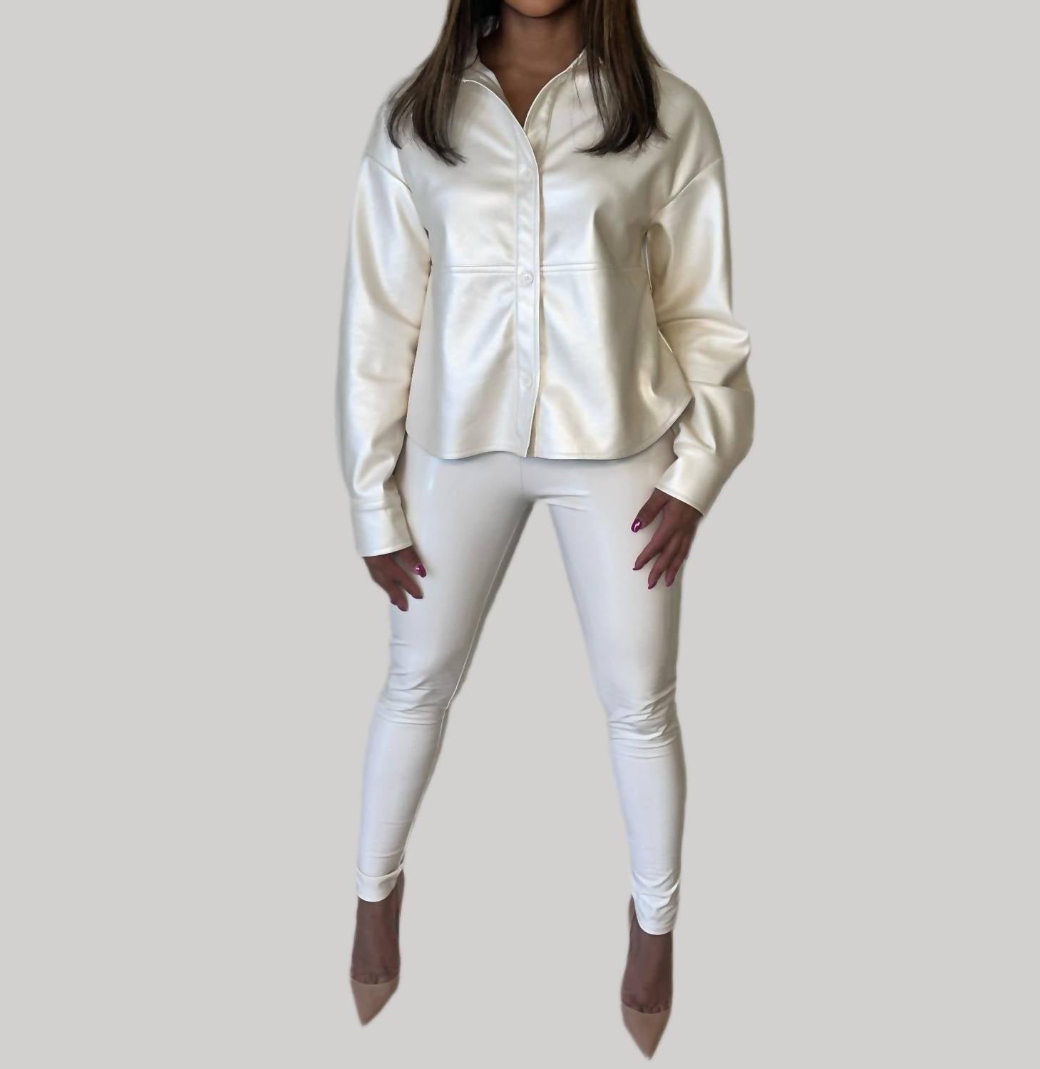 Introducing the Marlie Vegan Leather Top by DOLCE CABO, a standout piece in a stunning iridescent pearl hue that effortlessly elevates any ensemble. Crafted from exquisite faux leather, this versatile garment can be styled as a top or a jacket. Care instructions recommend dry cleaning or wiping with a damp cloth to maintain its polished appearance. Perfect for pairing with anything from denim to statement leggings, this top is a must-have for any contemporary wardrobe.