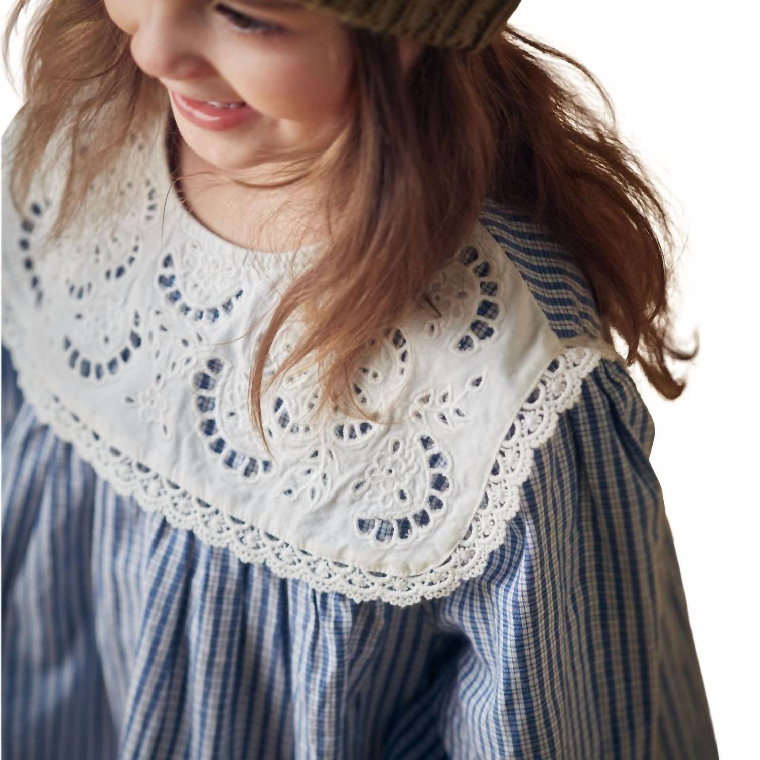 This blouse features puffed sleeves with elasticized, ruffled cuffs, large collar with English embroidery, and a delicate lace edge detail. Made from 100% organic cotton, this blouse is crafted in France with a button placket at the back for easy dressing. Ideal for machine washing, it's the perfect blend of style and practicality.