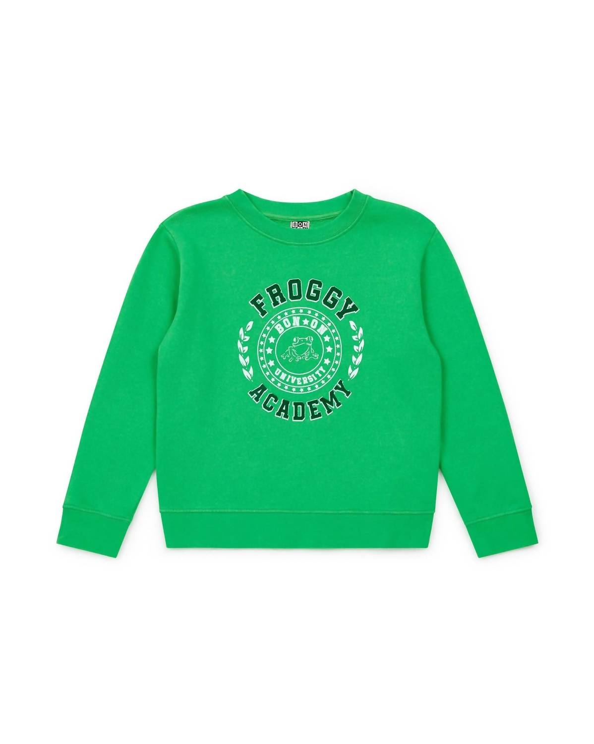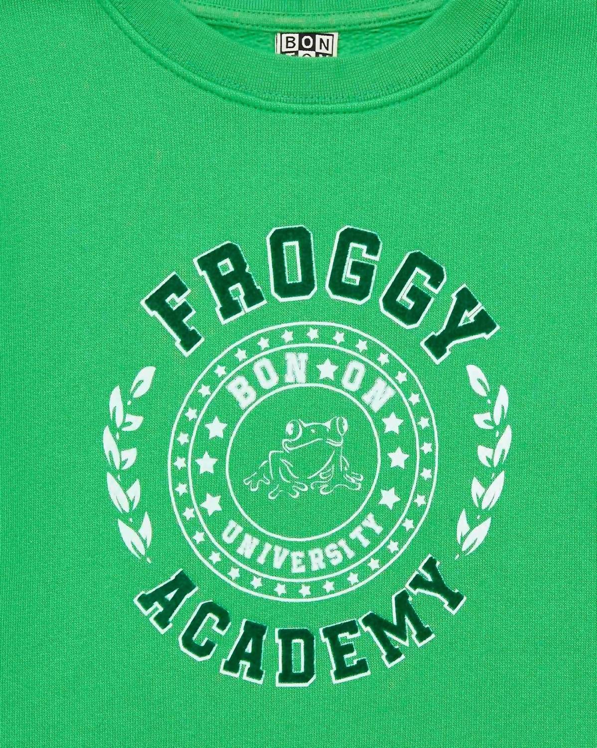 Introducing the Froggy Academy Fleece Sweatshirt by BONTON, a cozy addition to your little one’s wardrobe. Crafted from 100% cotton fleece, it ensures gentle warmth with its long sleeves. This green sweatshirt features a unique graphic print designed in the BONTON studio.