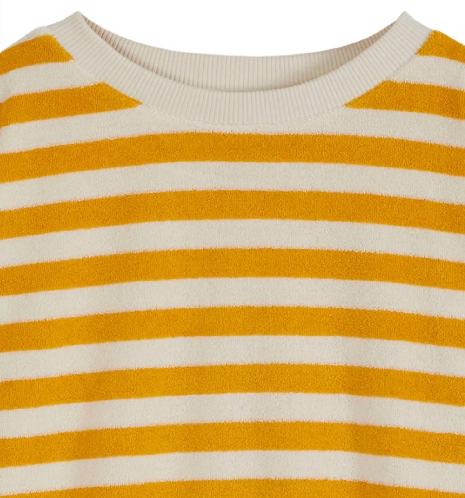 Introducing the Girl's Stripes Sweatshirt by Emile & Ida, a chic addition to your child's wardrobe. This stylish terry cotton sweatshirt features a delightful yellow and ecru striped pattern. Designed in France and crafted in Portugal, it promises quality and comfort with its ribbed collar, waist, and cuffs. Composition: 80% Cotton, 20% Polyester. Highlighting a playful and charming design, this piece is ideal for girls and showcases the brand's commitment to soft, natural fabrics, perfect for both play and relaxation.