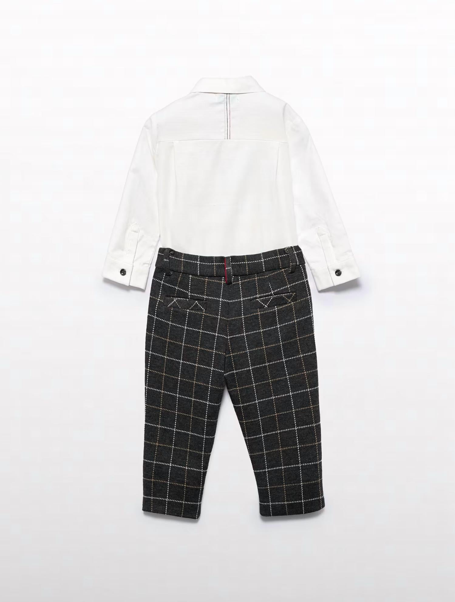 Introducing the Boy's Knit Plaid Pants Set by Abel & Lula in a charming charcoal grey. This set is crafted from 100% cotton, ensuring comfort and style for holiday events and beyond. Perfect for your little one's wardrobe, these cozy plaid pants are both stylish and practical. Make every occasion special with this adorable matching set.