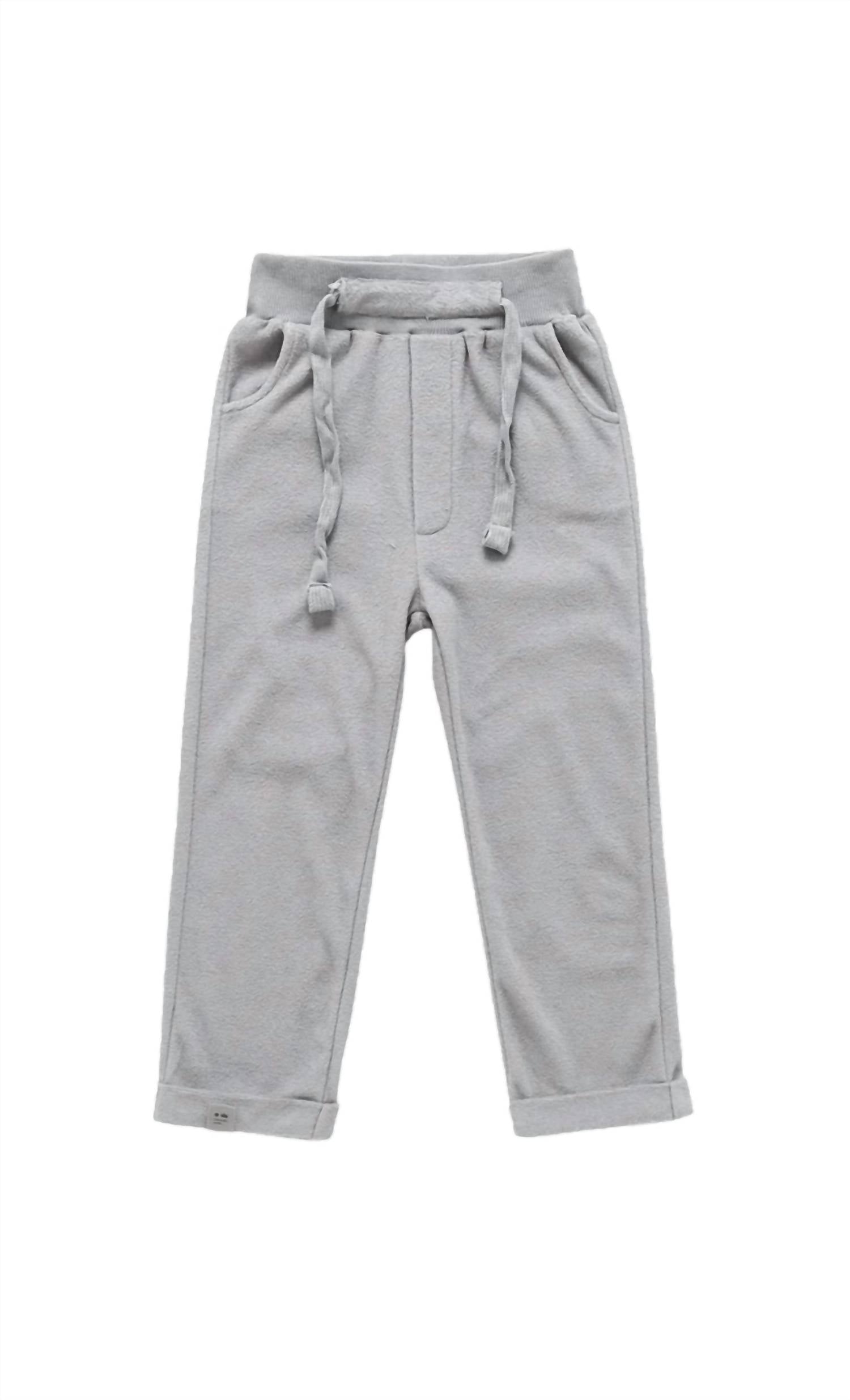These heather grey joggers boast a cozy and stylish fit, made entirely from 100% cotton terry cloth. The trousers feature a ribbed waistband for comfort, a tapered down design with rolled and tucked cuffs, and detailed terry patch accents between the drawstrings. Practical elements include rounded top stitch front pockets, a welt back pocket, and an embossed faux suede logo label on the cuff, all contributing to its relaxed yet refined look.