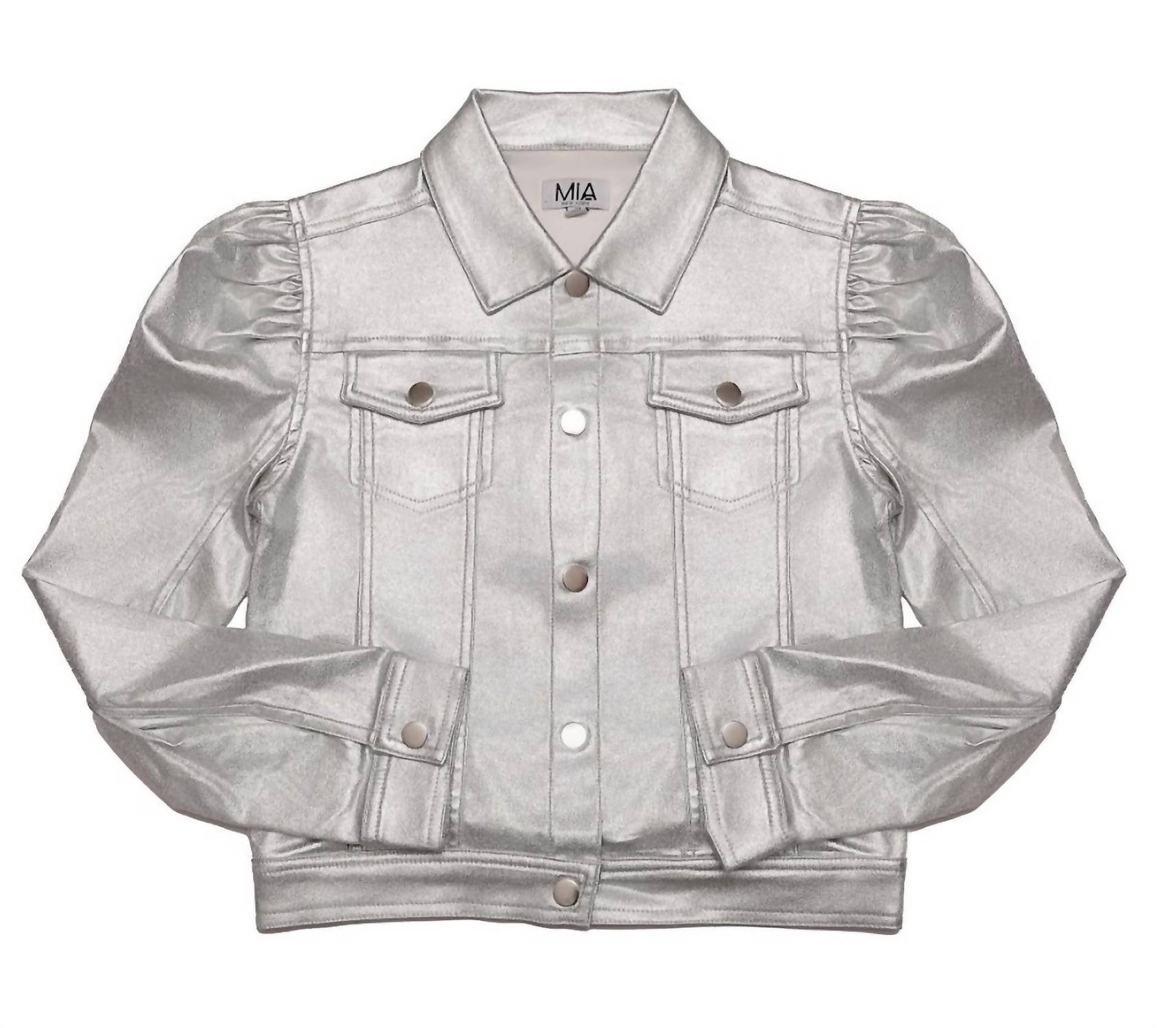 Introducing the Girl's Pleather Jacket by MIA, a fashion-forward piece crafted for young trendsetters in striking metallic silver. This versatile jacket features trendy puffed shoulders and a tailored fit, elevating any ensemble from casual denim to chic dresses. Designed with functional snap buttons and pockets for added convenience, it's perfect for various occasions. Pair it with a matching skirt for a bold look, or style it with sneakers for a cool, laid-back vibe.