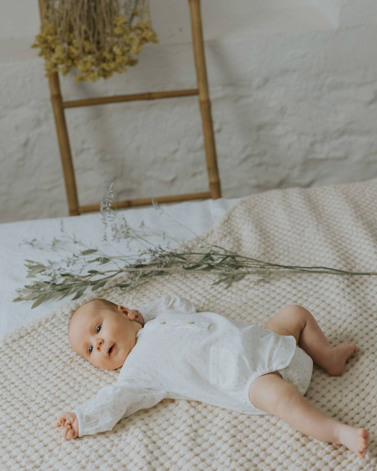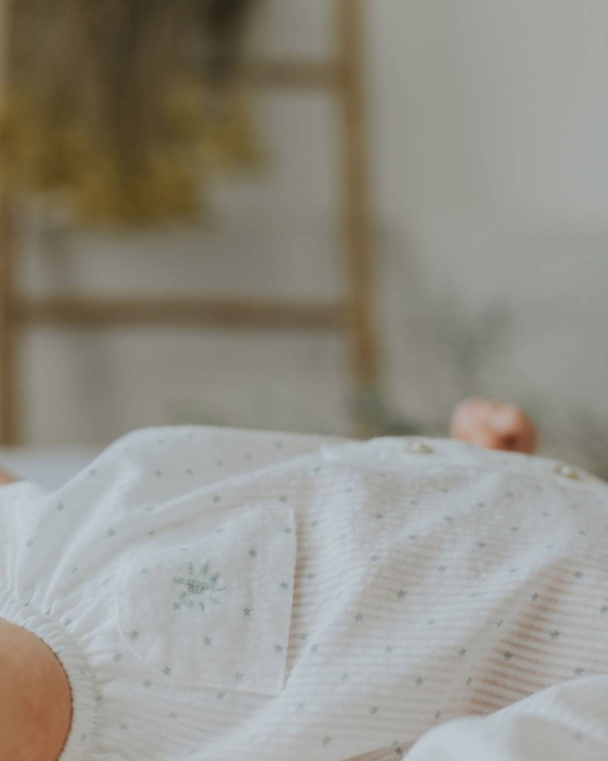 Introduce your little one to comfort and style with the Baby's Stars Romper by Búho, featuring charming long sleeves and an all-over stars print. This romper is crafted from 100% organic cotton voile, offering a soft feel against delicate skin. Made in Portugal with Spanish fabric, it includes a convenient front opening with three buttons and press stud fastenings at the crotch for easy dressing. Decorated with two front pockets, this romper brings a touch of playfulness to any occasion, while it can be easily maintained with machine wash care.