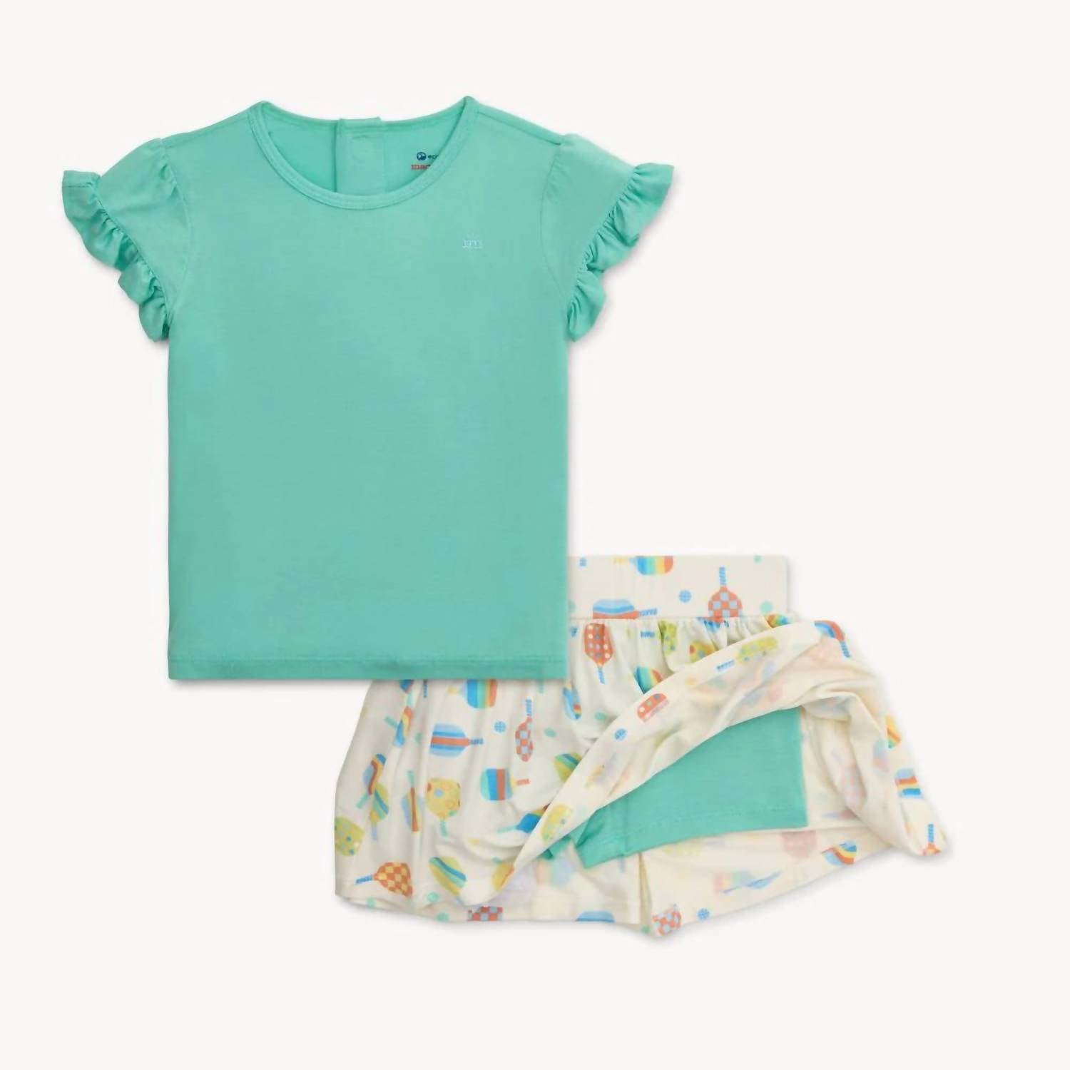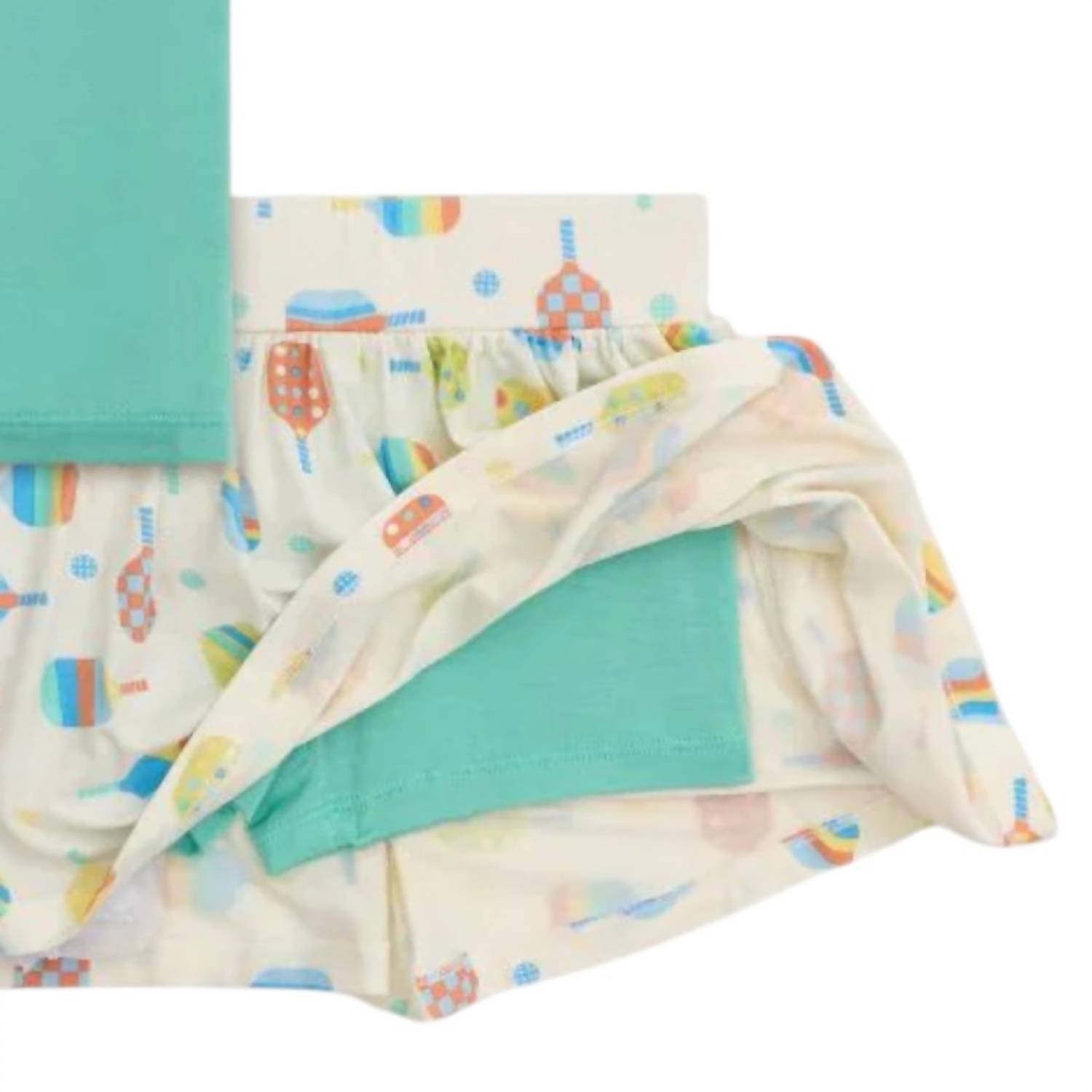 Introducing the Girls Modal Top and Skort Set by Magnetic Me, beautifully designed in a charming Perfect Pickle Paddles color. This delightful set features short sleeves and is crafted from 94% TENCEL™ modal and 6% elastane, providing a soft, long-lasting, and eco-friendly composition ideal for active play. With a convenient SewSafe™ magnetic closure at the back of the neck, dressing becomes a breeze. Care: Easy machine wash, making it perfect for busy schedules.