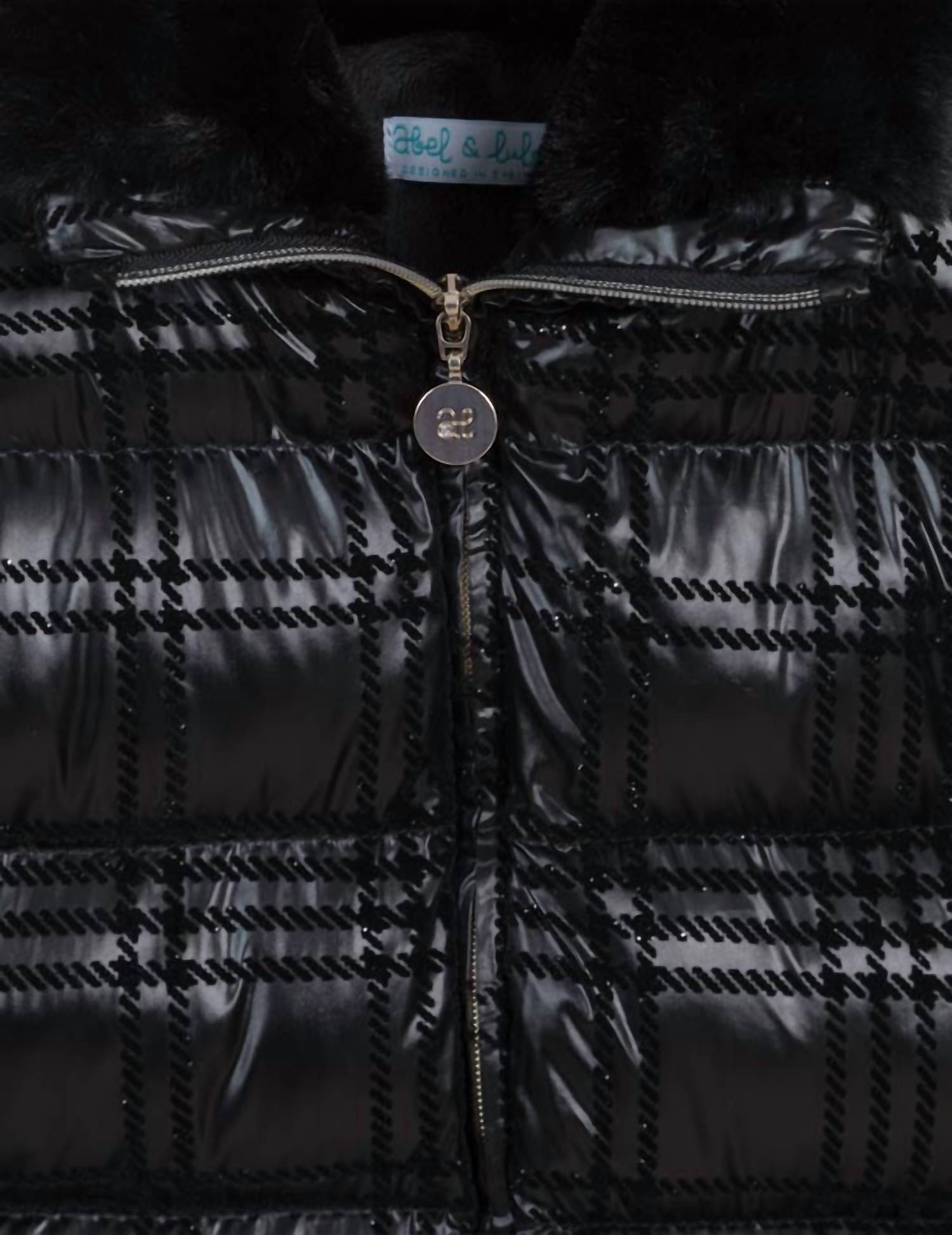 Introducing the Girl's Flock Print Fur Lined Coat by Abel & Lula, a chic addition to any young fashionista's wardrobe. This black coat features a sophisticated waist-cut design with a warm faux fur lining for added comfort. Composition includes a 90% Polyamide and 10% Polyester exterior, with a 100% Polyester lining and filling. Closure: Convenient zipper front closure. Care: Refer to icons for washing instructions.
