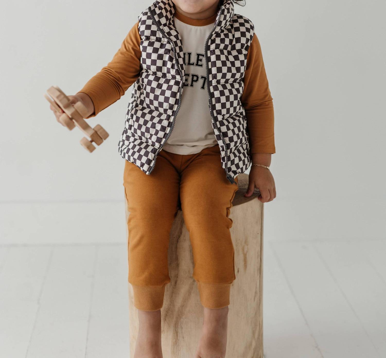 Introducing the Warm Puffer Vest by babysprouts, crafted with attention to detail and designed for women's comfort. This versatile vest showcases a stylish checkered pattern in Gray Wash, a plaid & check design that stands out. Made from durable materials, it features lightweight insulation that ensures warmth without bulk. Please note, the Checkered in Gray Wash has a dark bronze hue for this season.