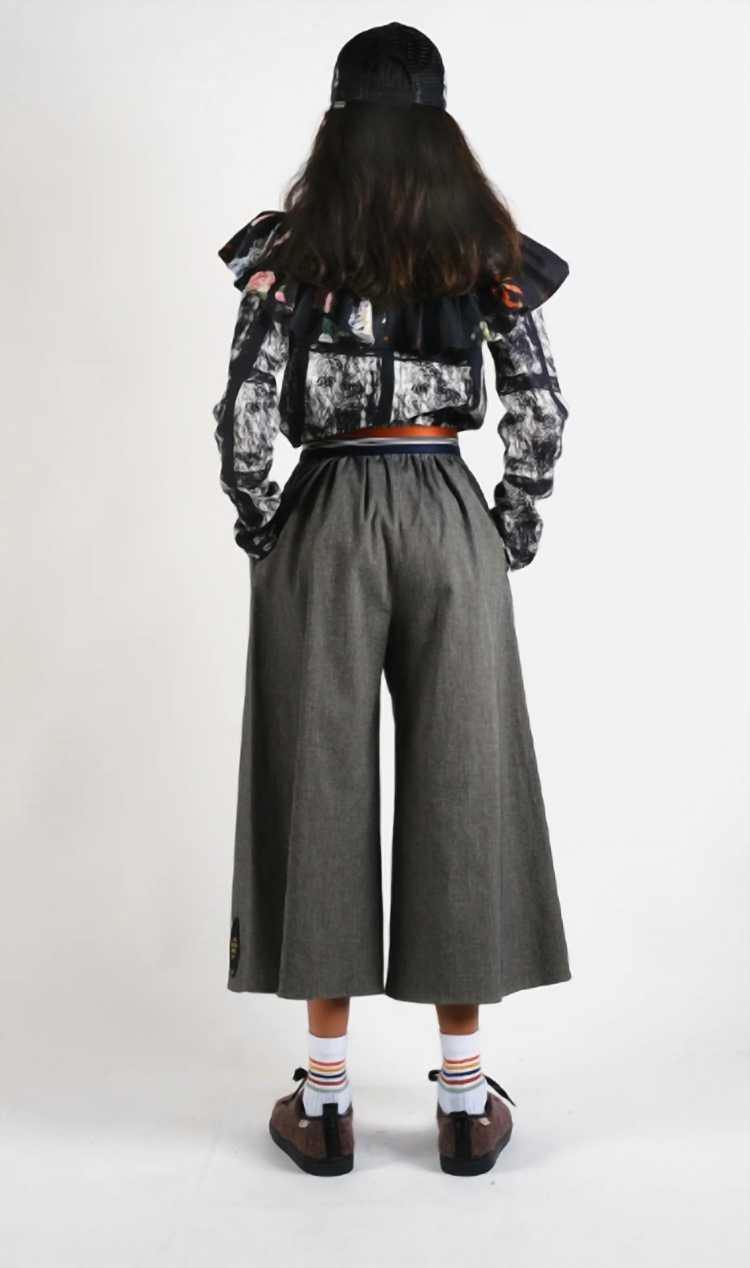 Elasticated waist. Cropped trouser. With patch. 100% Polyester.