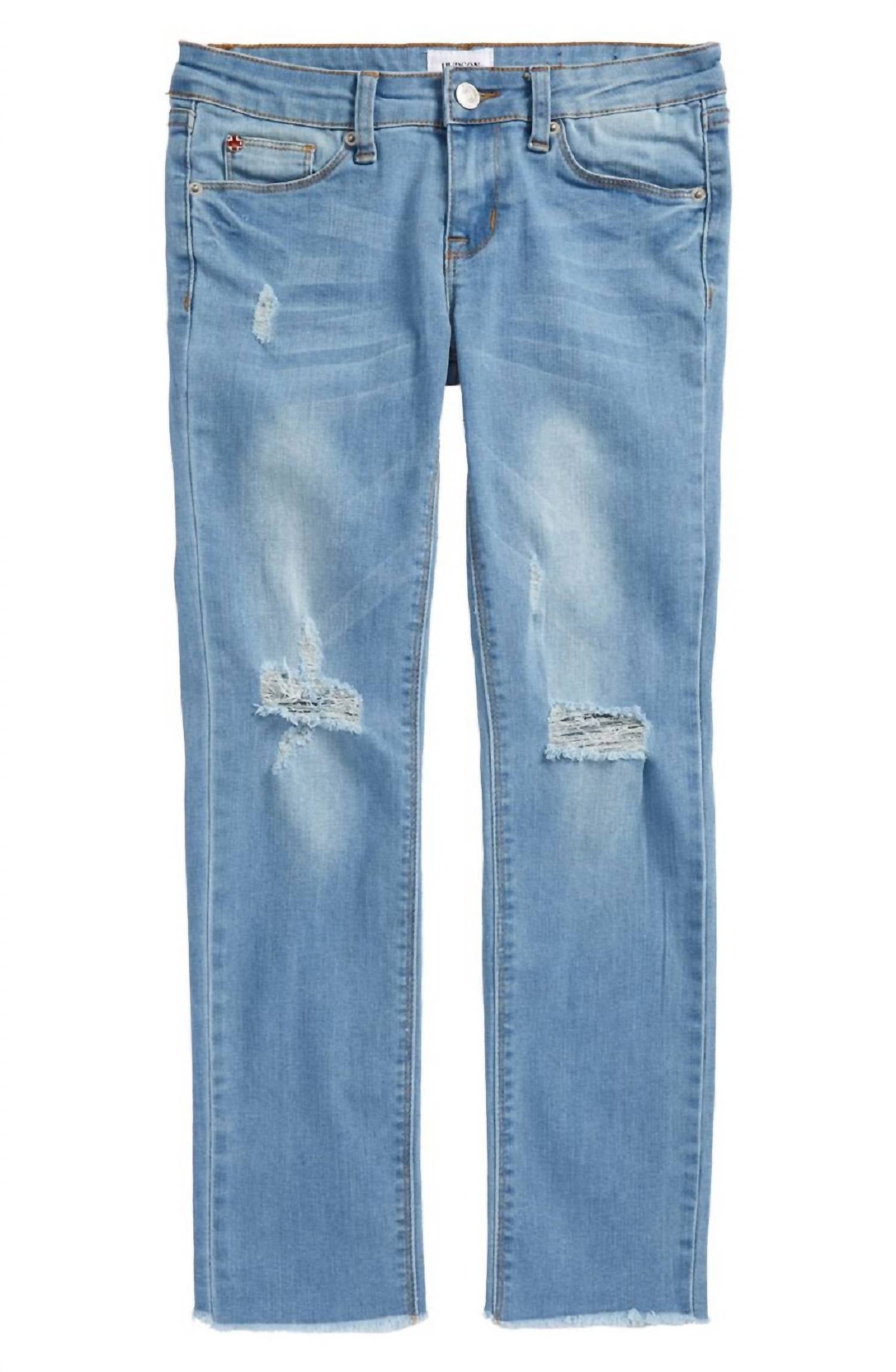 Elevate her wardrobe with the Girl's Vintage Ankle Skinny Jeans by Hudson, crafted in a stylish vintage wash. These jeans boast a classic five-pocket design with contrasting gold stitch detail, adding an edgy touch with allover distressing and a raw bottom hem. Made from a comfortable cotton blend of 69% Cotton, 20% Polyester, 10% Viscose, and 1% Spandex, they feature a button and zip closure for a secure fit. Designed for easy care, simply machine wash cold on a gentle cycle and tumble dry low.