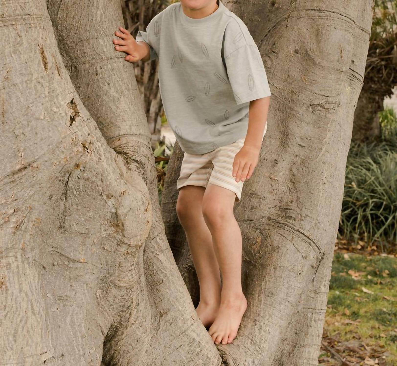 Get your little surfer dude beach-ready with the Rylee + Cru Surfboard Relaxed Tee, featuring short sleeves and crafted from 100% cotton for a soft feel. This seafoam tee boasts a graphic surfboard print, adding a playful touch to any summer outing. Designed for easy wear, baby sizes come with snaps at the shoulder for hassle-free changing. Care instructions include machine washing in cold and tumble drying on low, ensuring convenience for busy parents.