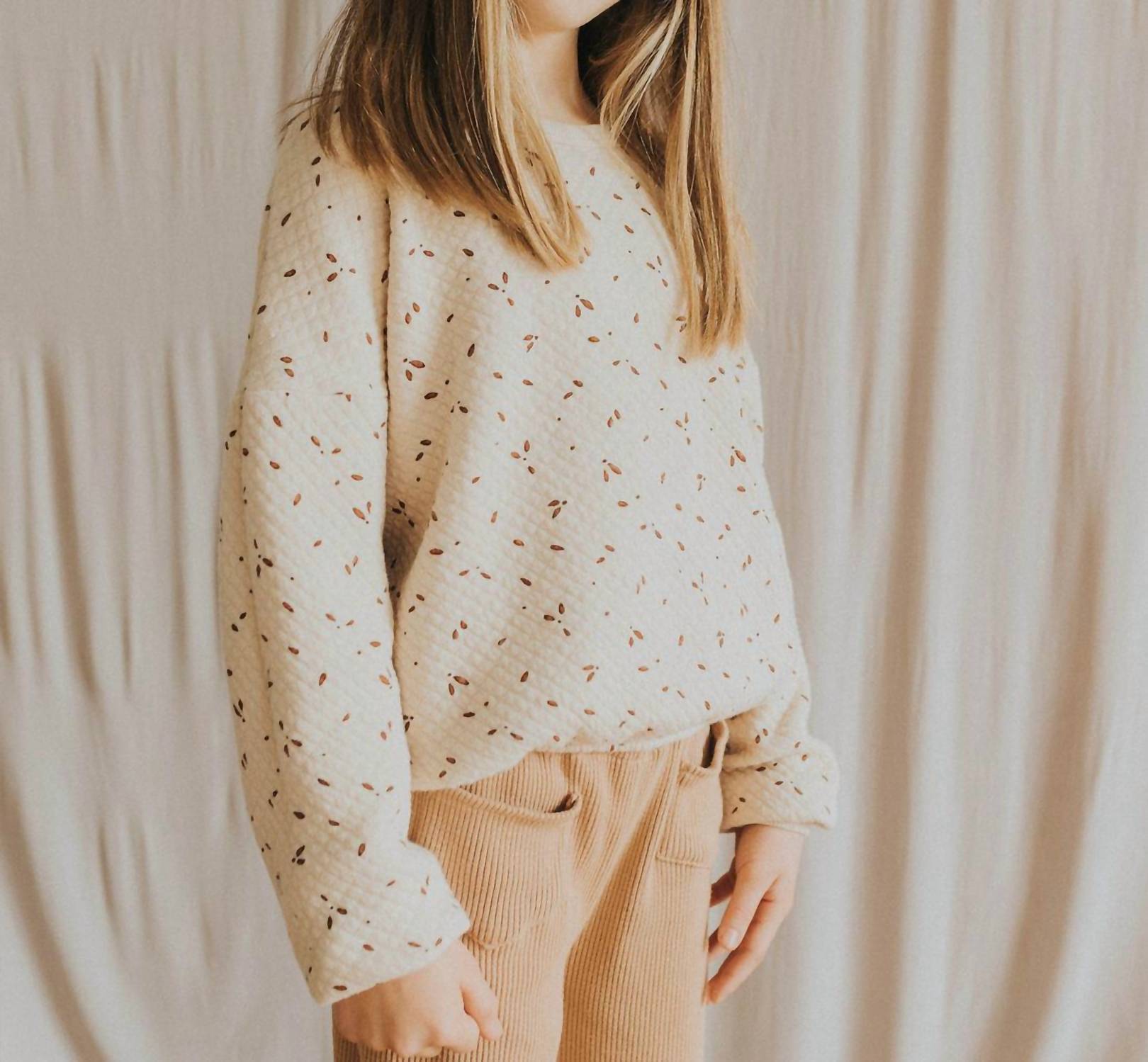 A delightful addition to any wardrobe with its sand-hued autumn graphic pattern. This sweatshirt features raglan sleeves and three buttons at the neck for easy wear. Made of 100% Spanish cotton, this piece is crafted with comfort and quality in mind. Proudly made in Spain.
