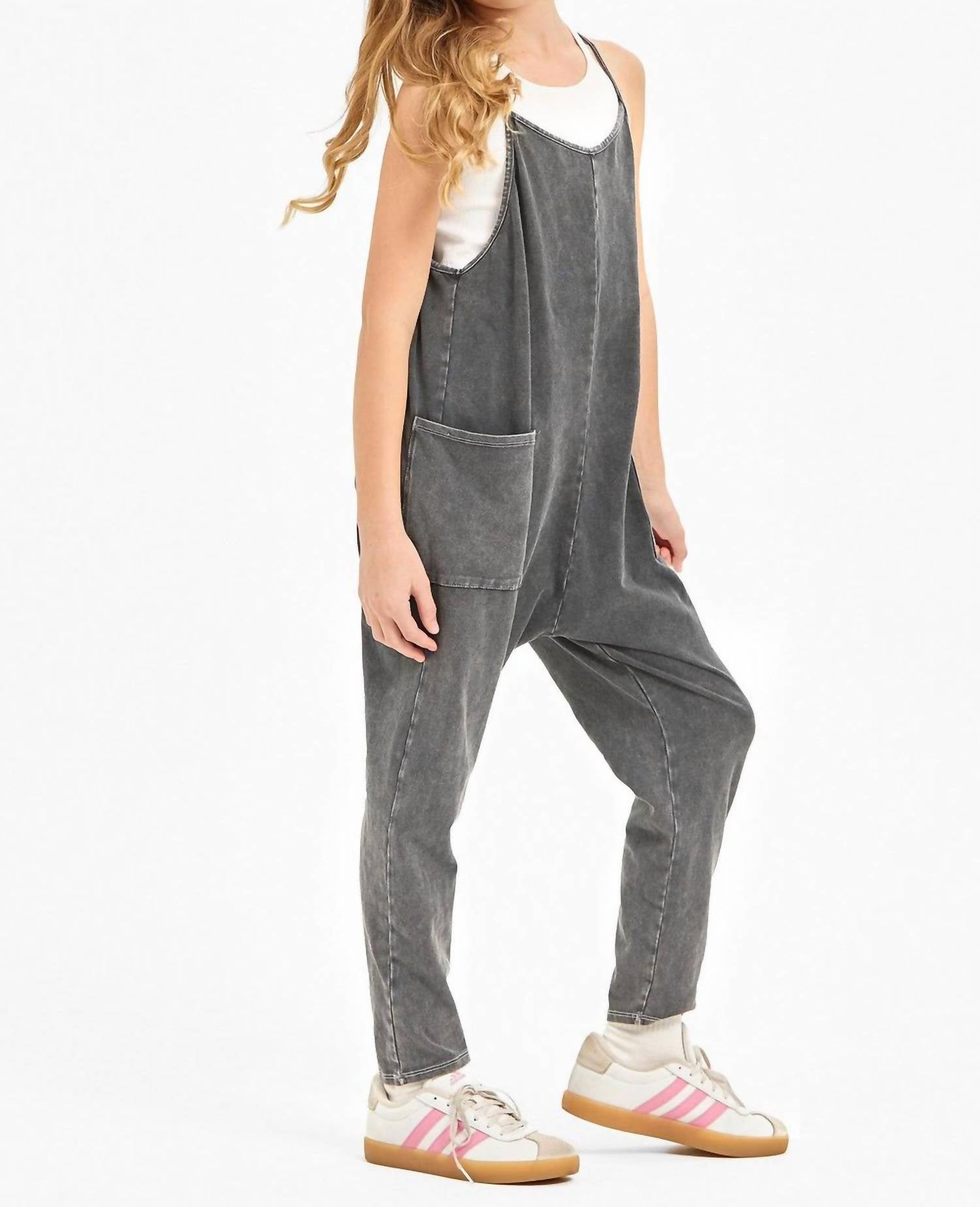 Introducing the Mineral Wash Sleeveless Jumpsuit by Good Girl, a fashion-forward piece in a striking grey hue. This jumpsuit boasts a unique mineral wash design with a drop crotch fit, providing an effortlessly cool look. Made for girls with a solid pattern, this standout piece promises to elevate any wardrobe. Care: Line dry.