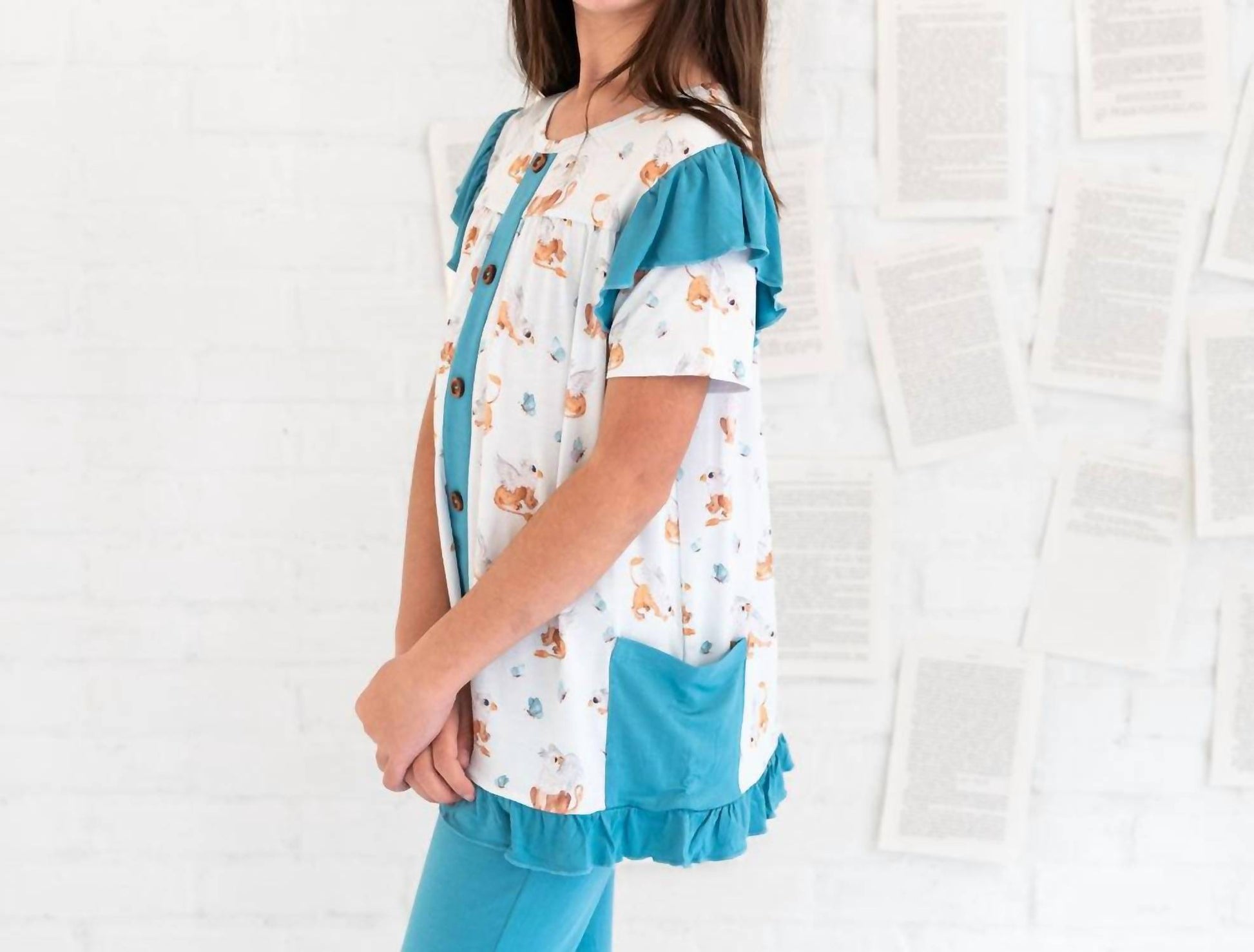 Dress your little one in the charming Girls Griffin Butterflies Bamboo Short Sleeve Tunic Legging Set by Laree + Co., perfect in a chic white and teal. This signature set includes a tunic style top with delightful ruffled sleeves, ideal for twirling with its flowy design. Made from 95% viscose from bamboo and 5% spandex, it's both buttery soft and super stylish. Designed with love in Kansas and made in China, it offers lightweight breathability; just wash on delicate, tumble dry low, and avoid bleaching for easy care.