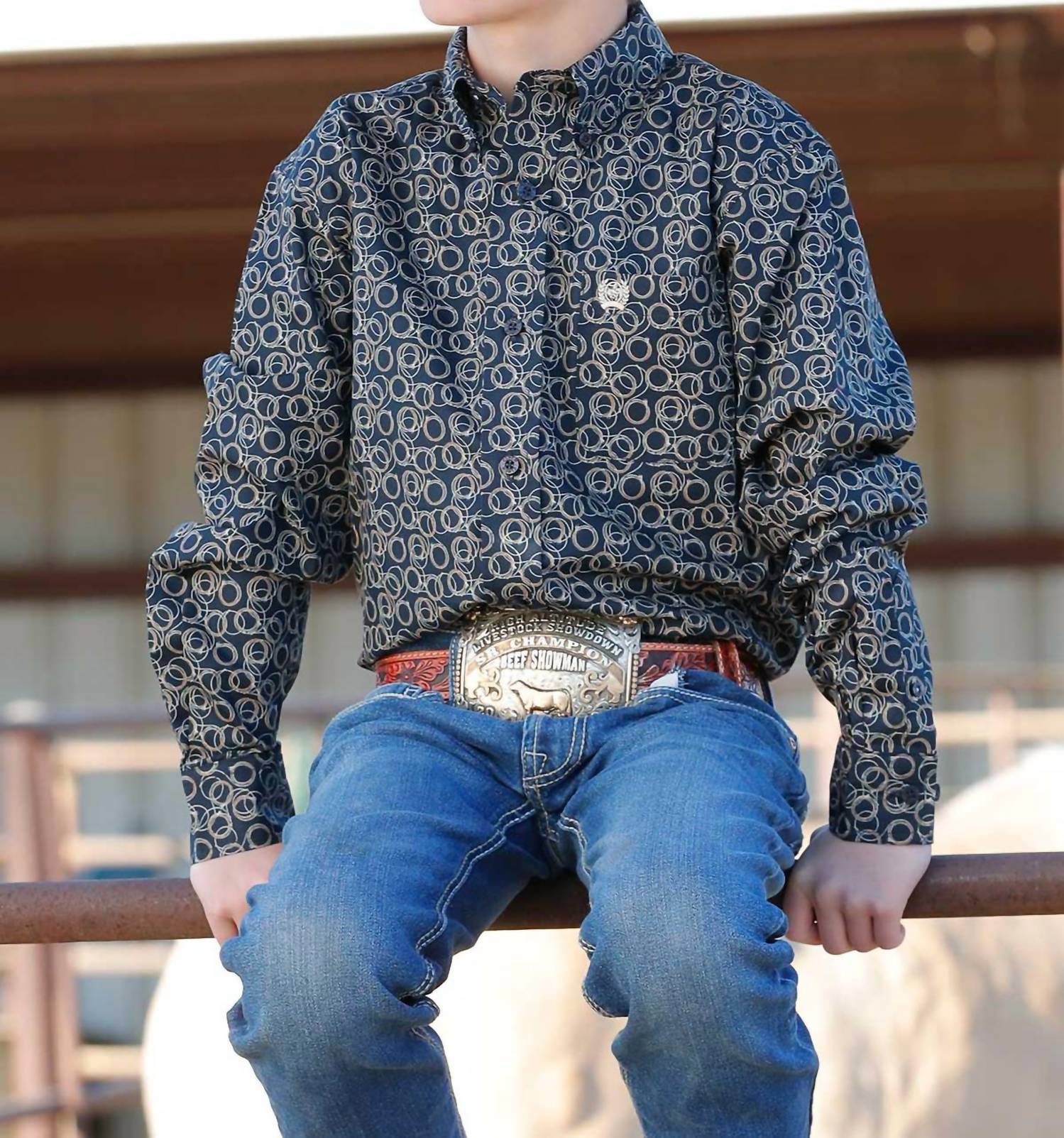 Elevate your boy's wardrobe with the Long Sleeve Geometric Print Button Down from CINCH, featuring a trendy navy geometric pattern perfect for spring holiday parties. This button-down offers long sleeves and a stylish design tailored for comfort and effortless style. Closure: Button closure. Crafted to be a staple piece for any young trendsetter.