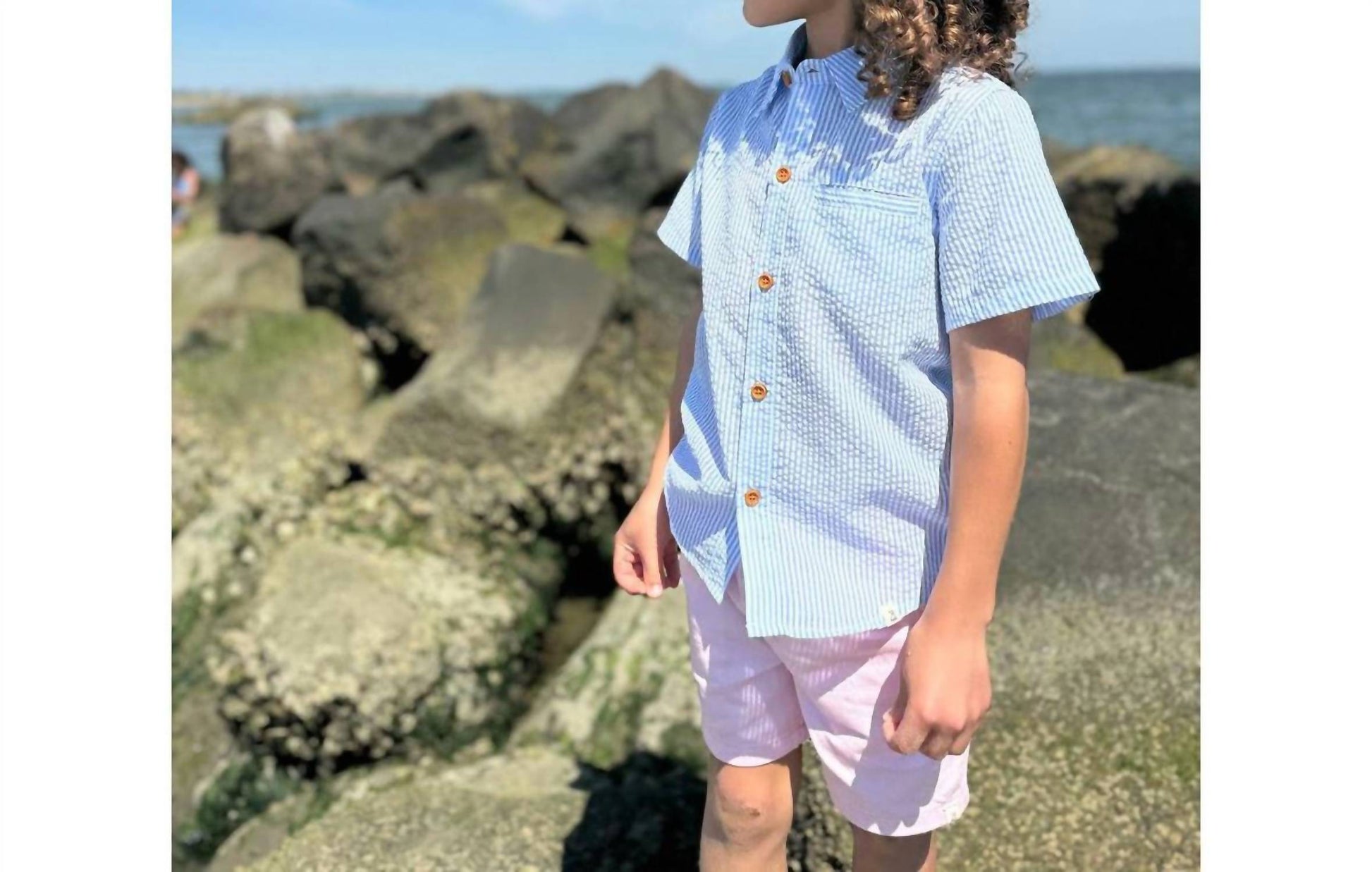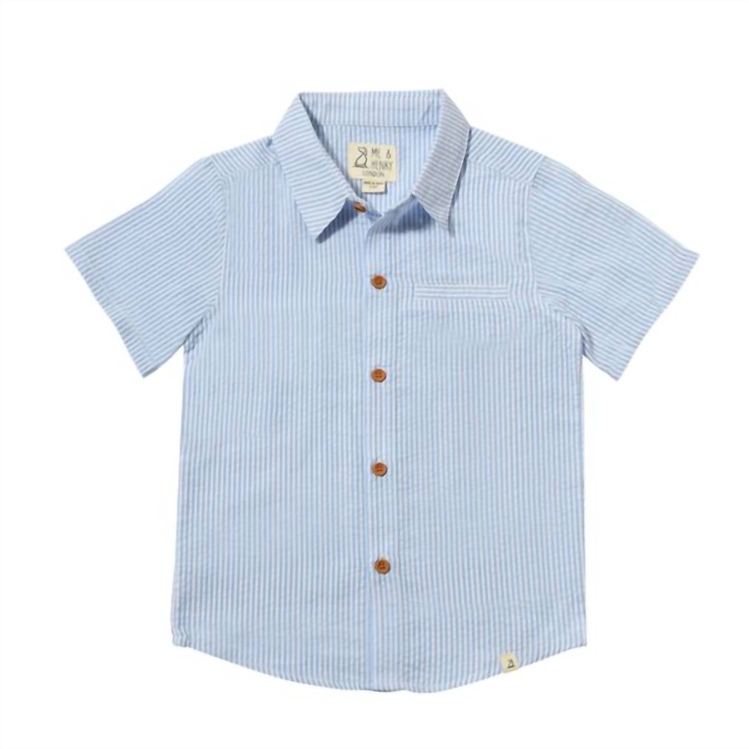 Introducing the Newport Woven Shirt by ME & HENRY, a delightful choice in Blue Stripe Seersucker for your little one's wardrobe. This shirt boasts a classic stripe pattern on a cool, crinkled texture, crafted from 100% cotton seersucker for lightweight breathability. Ideal for warm days or as a layering piece, it blends playful style with comfort. Perfectly designed for boys who enjoy a mix of fun and classic fashion.