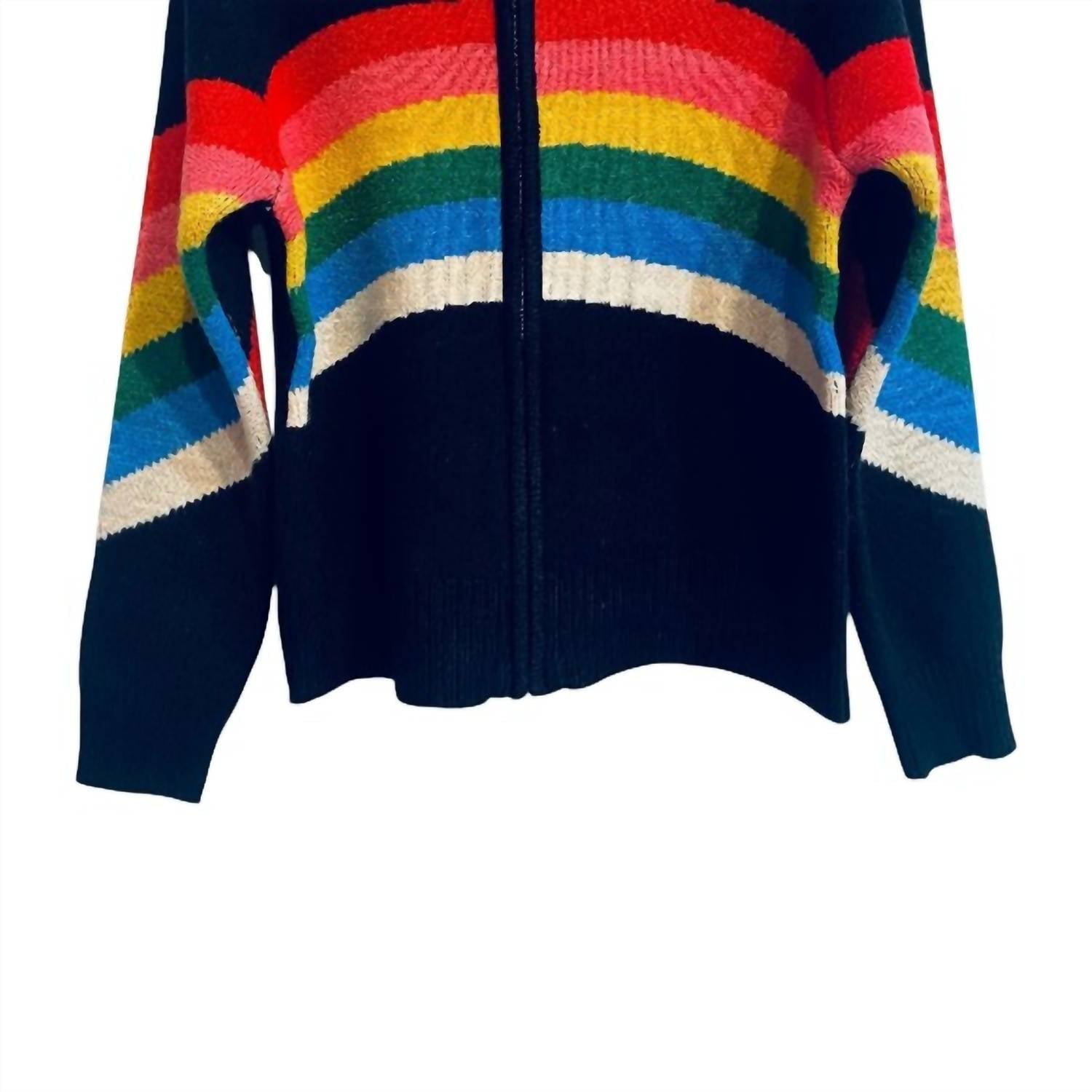 Introducing the Kid's Black Hart Rainbow Zip Hoodie Sweater by Central Park West, perfect for stylish young girls. Crafted with 80% Rayon, 20% Nylon, this striped hoodie offers a comfortable fit and a classic zipper closure. Made in an irresistibly preppy fall design, this sweater serves as a great travel companion, especially around Thanksgiving. Care for the fabric with machine washes and lay flat to dry.