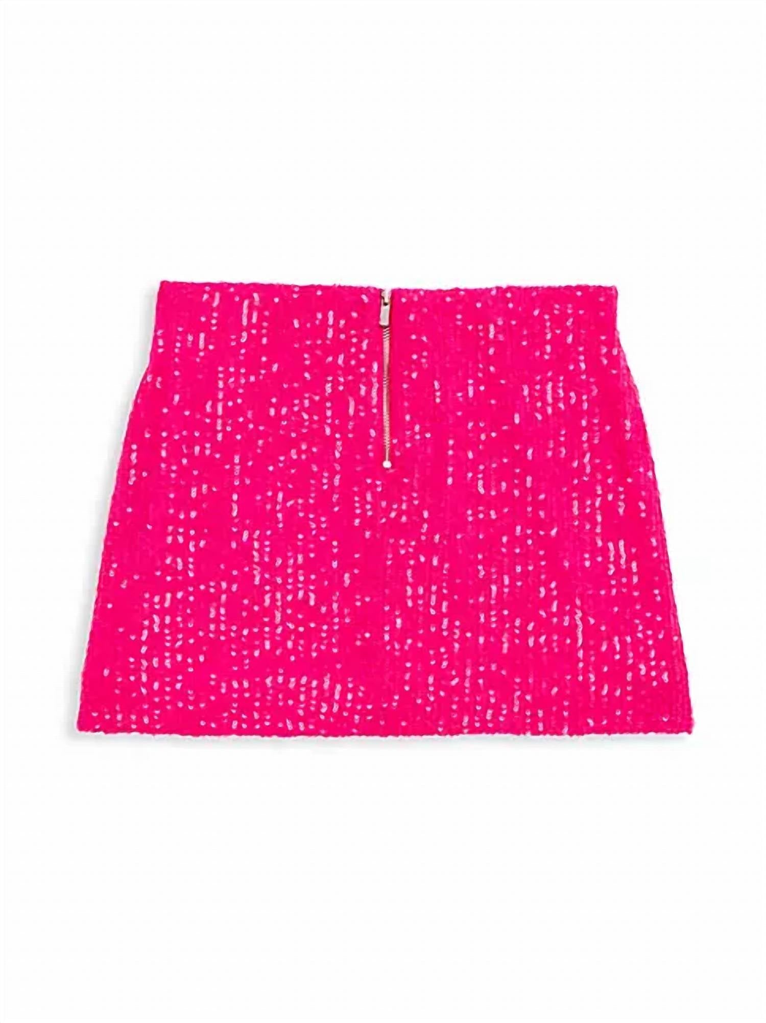 Add a pop of sparkle to her wardrobe with the Kids Sequin Skirt by Katie J NYC, crafted from dazzling neon pink polyester. This mini skirt is beautifully detailed with sequin embellishments and features a striking slit at the front hem for added flair. Its exposed back zipper ensures easy wearability, suitable for any spirited occasion. With its textured pattern, remember to keep it looking fabulous by opting for dry clean only.