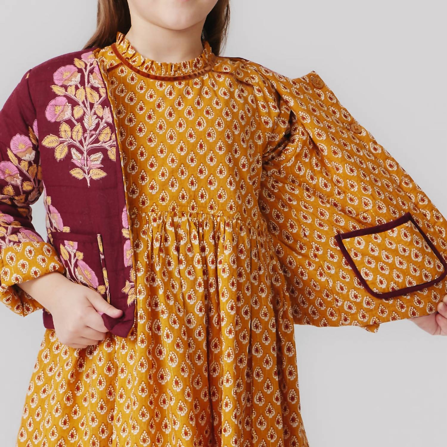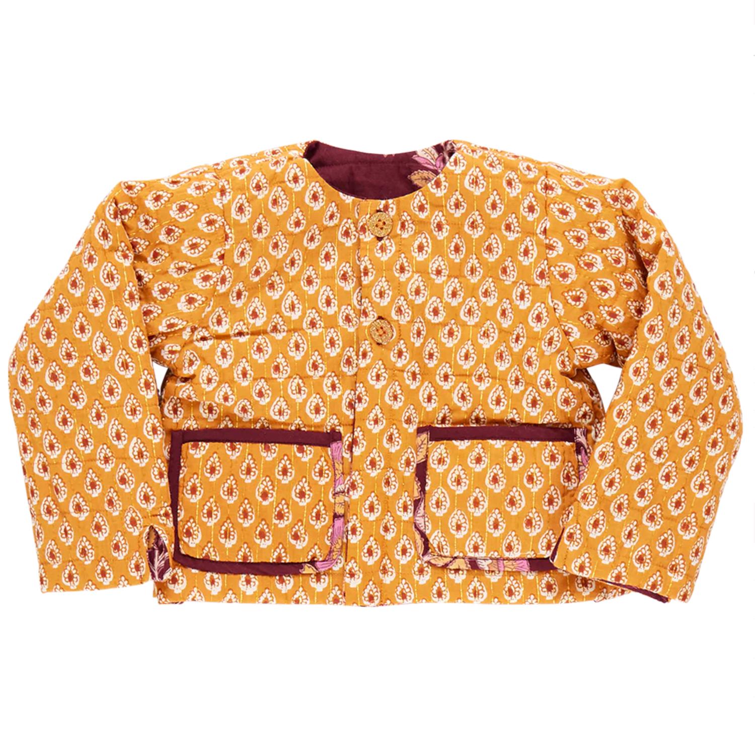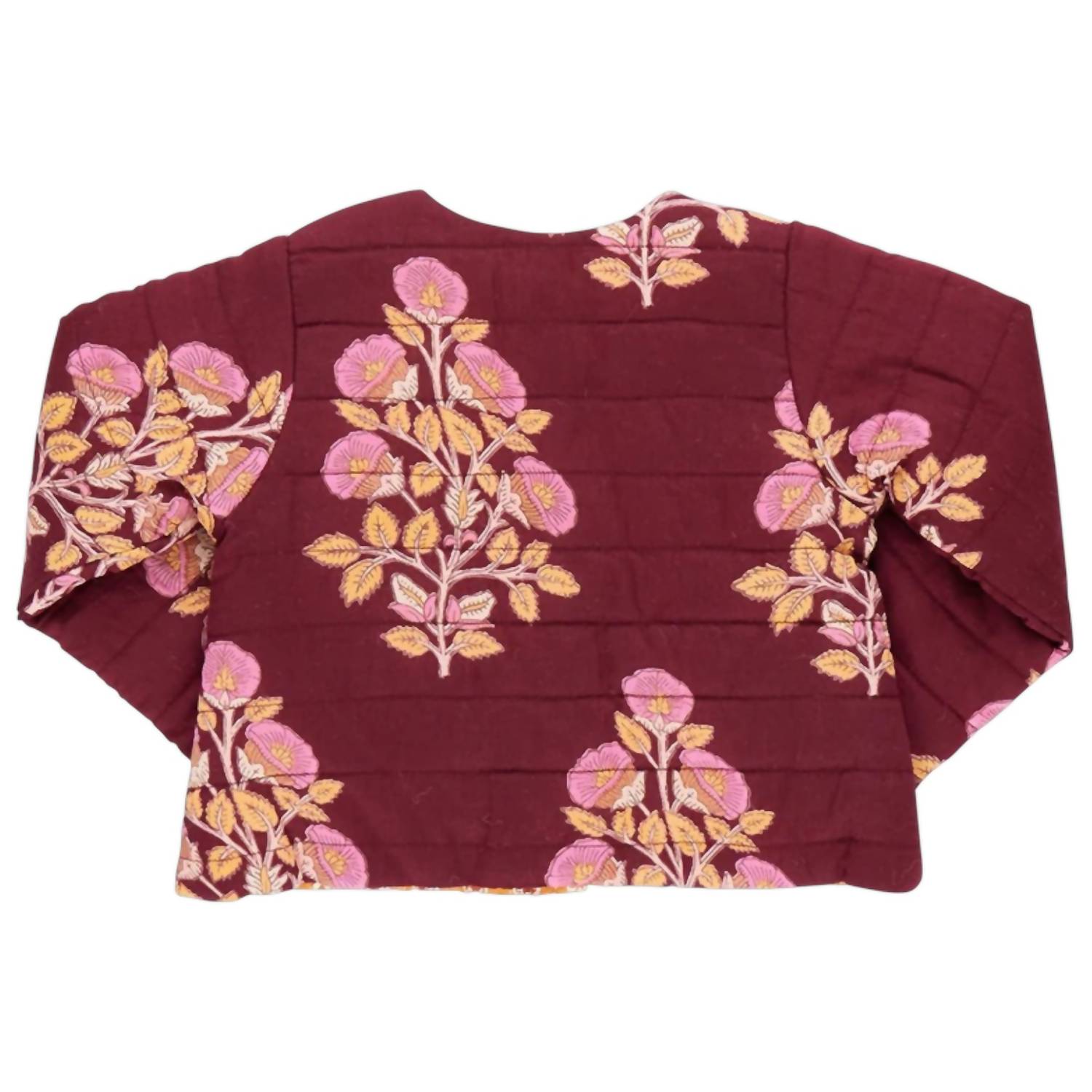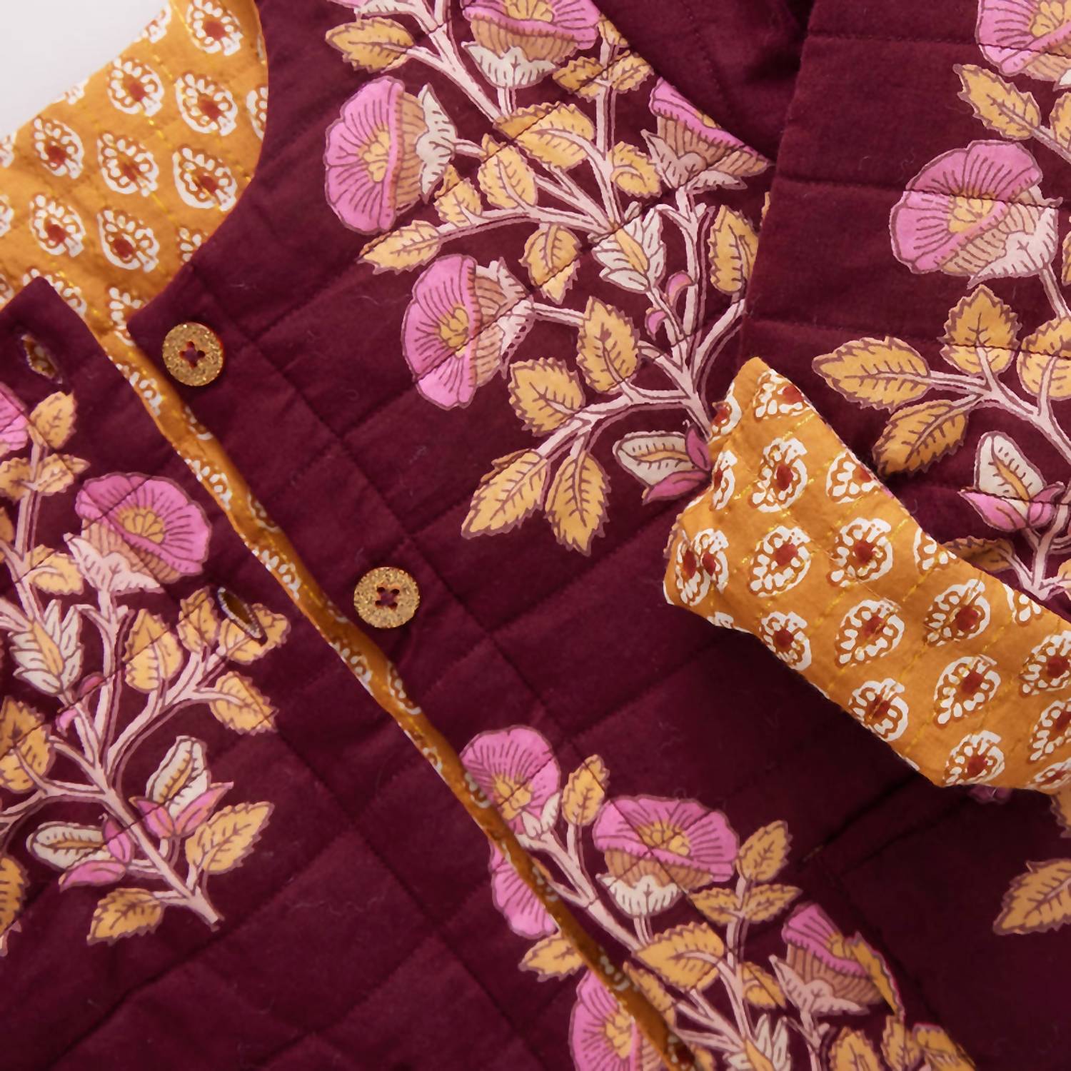 Experience versatile style with the Pink Chicken Reversible Quilted Jacket in Burgundy Bouquet Floral, an embodiment of Boho Chic aesthetics. This jacket features slit sleeves and a reversible design with contrasting prints, showcasing two classic Indian blockprints. Crafted from 100% cotton flat gauze in India, it boasts two large gold glitter buttons for closure and two front pockets for added convenience. For care, machine wash cold on a gentle cycle and tumble dry low, avoiding bleach for long-lasting wear.