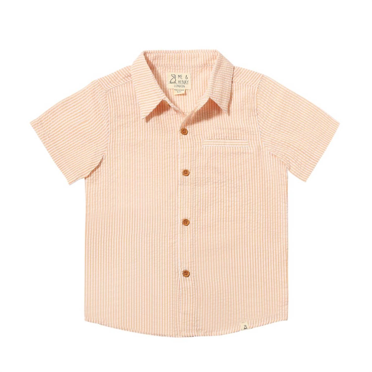 Introducing the Boy's Newport Woven Stripe Shirt by ME & HENRY, perfectly crafted for summer vacations in a 90s fashion. This breathable cotton button-down shirt features a seersucker material for a textured look, enhanced by its vibrant tangerine stripe pattern. Designed for easy styling, this piece boasts a classic collared design, making it an ideal addition to any boy's wardrobe. Made from quality cotton material, this shirt ensures all-day comfort during any vacation adventure.