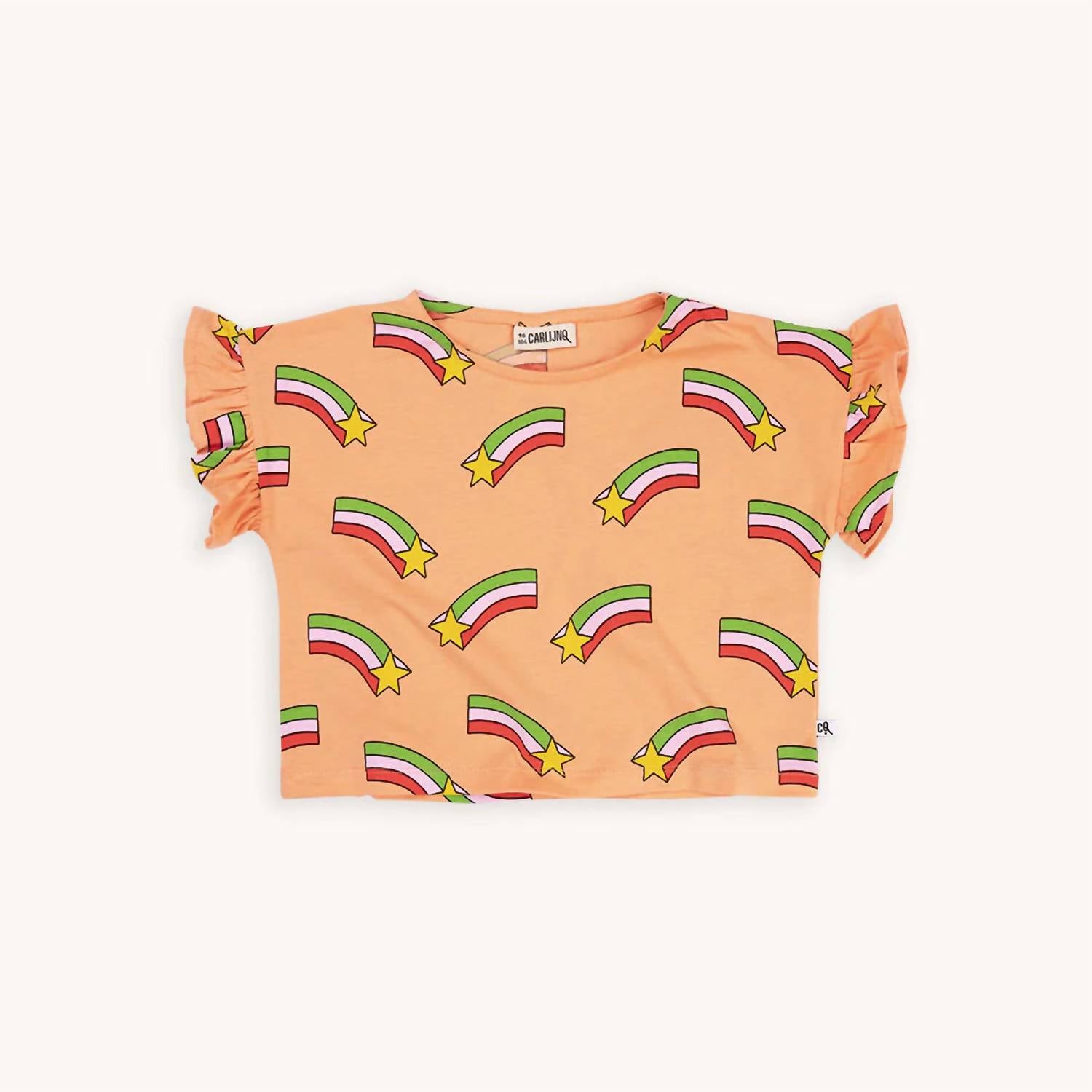 Rainbow print ruffled top short sleeve. Machine wash warm. 95% organic cotton, 5% Elastane.